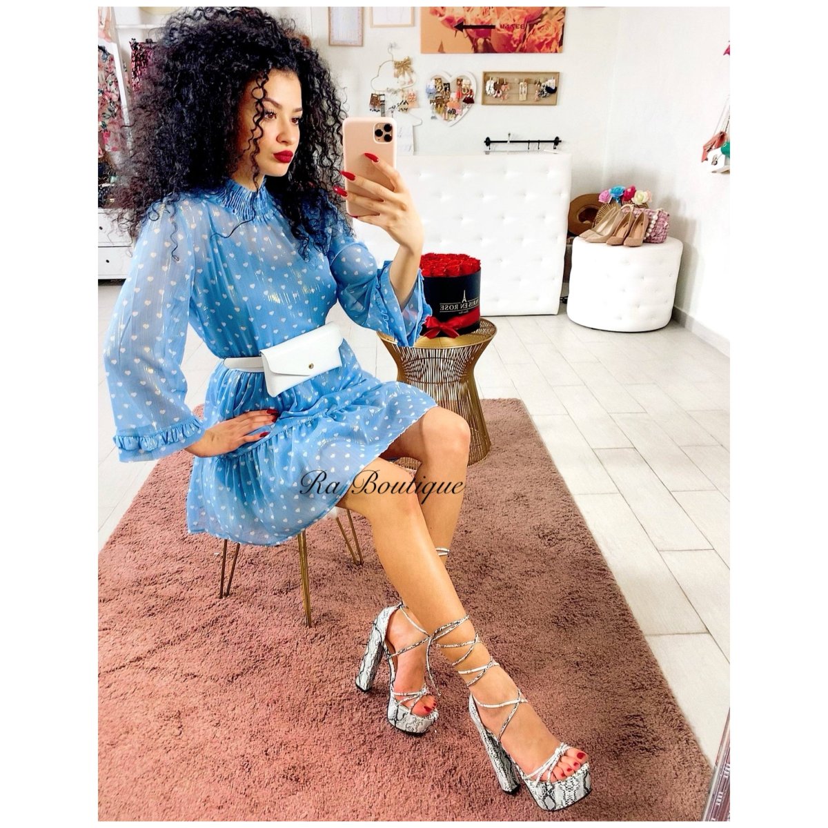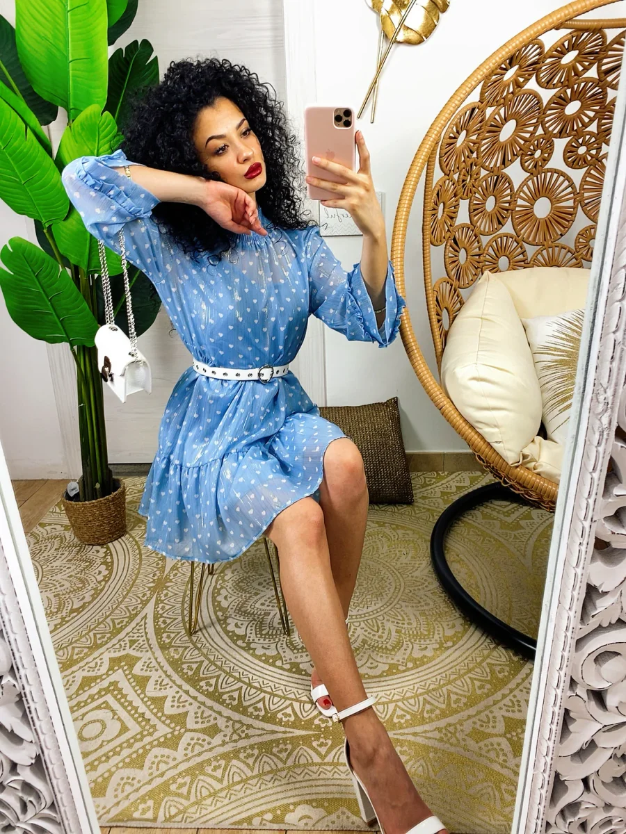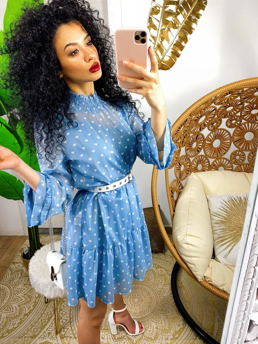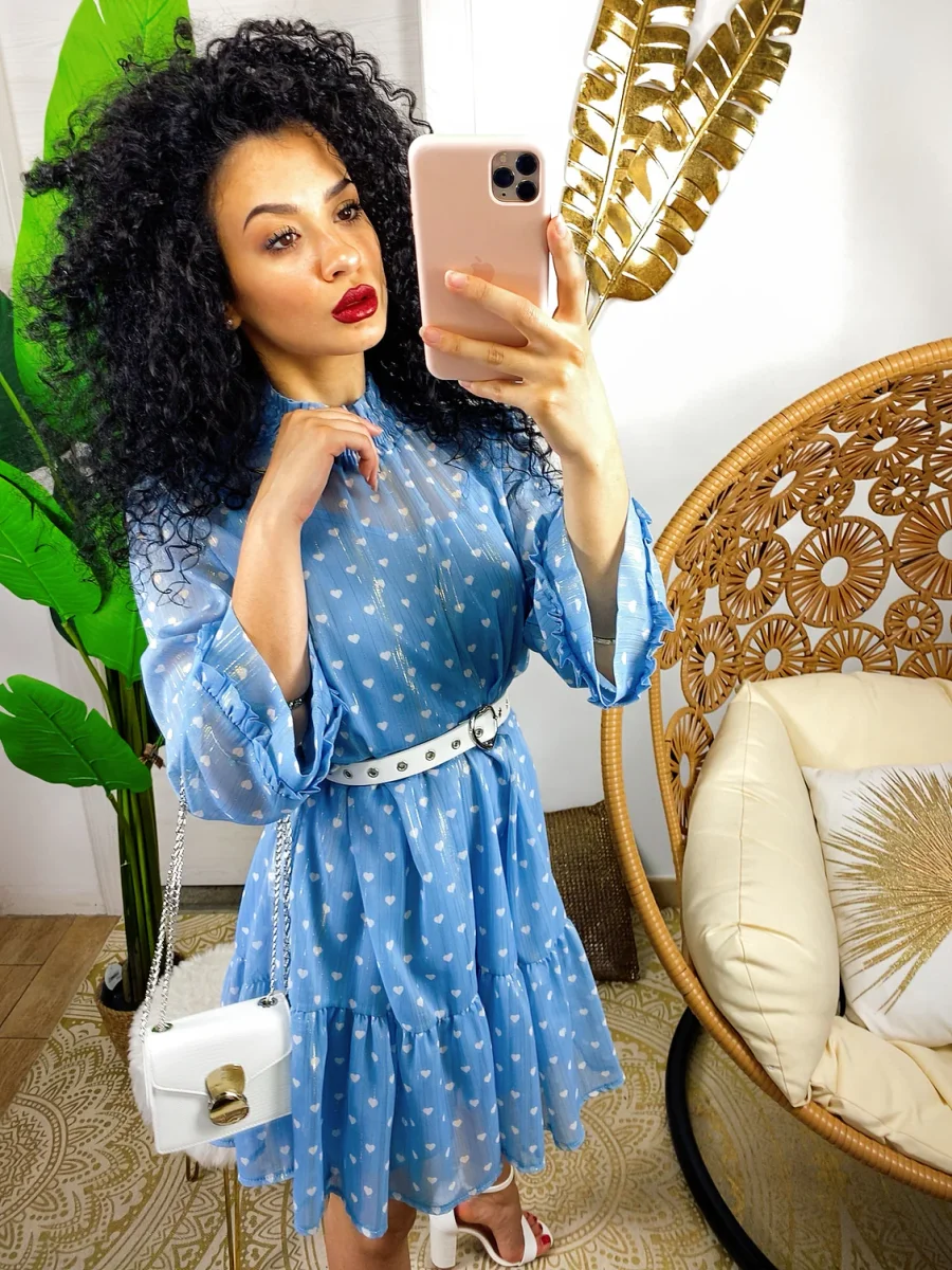 Abito a cuoricini a balze con cuoricini bianchi. Fodera inclusa tono su tono. Vestibilità morbida