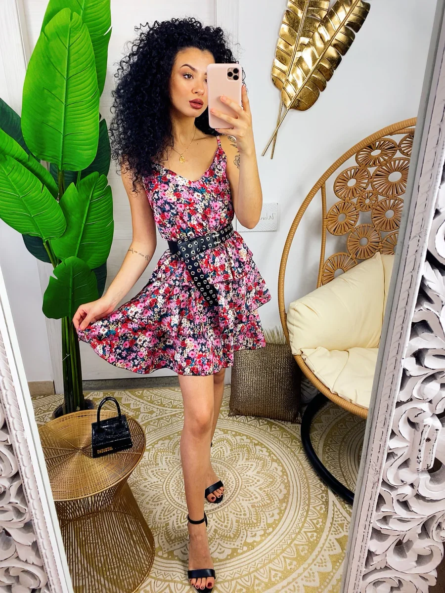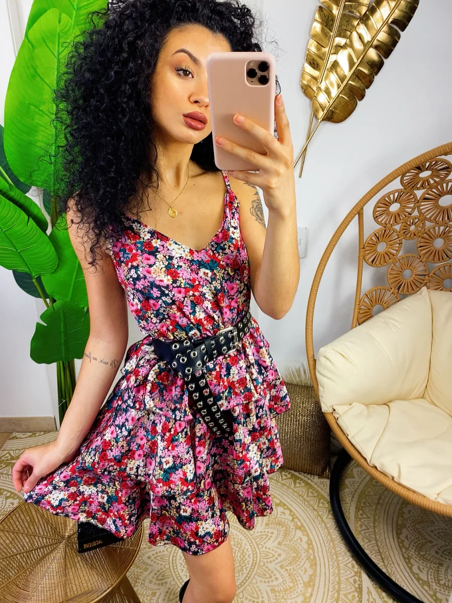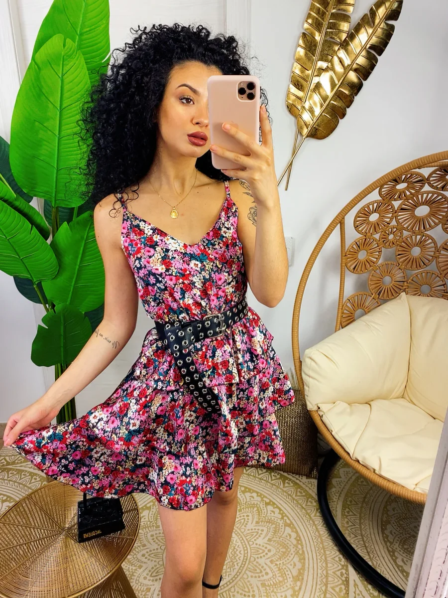 Abito a balze a fiori base nera. Tessuto liscio in raso con tre balze tono su tono. Abbinalo con una cintura in vita.