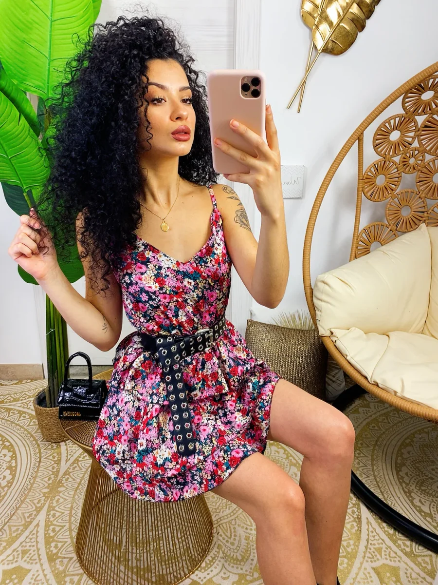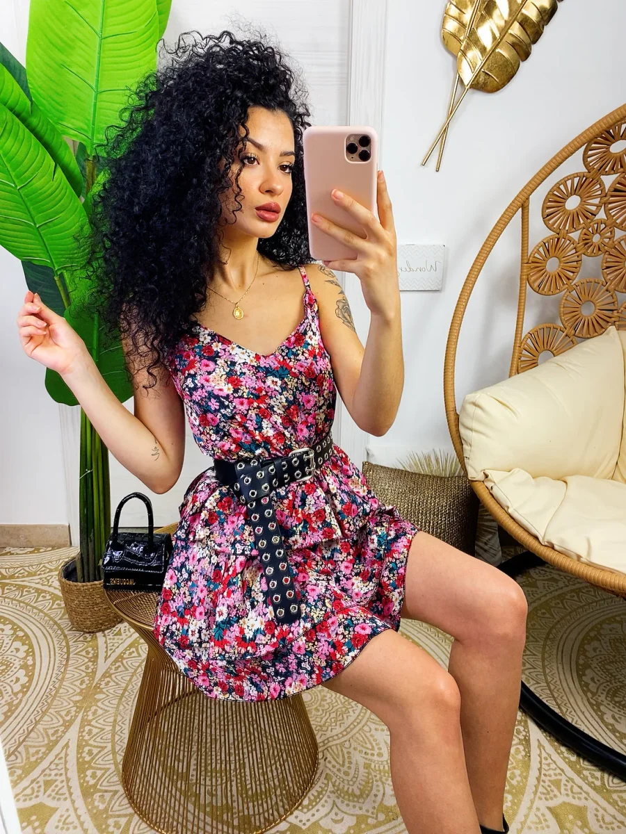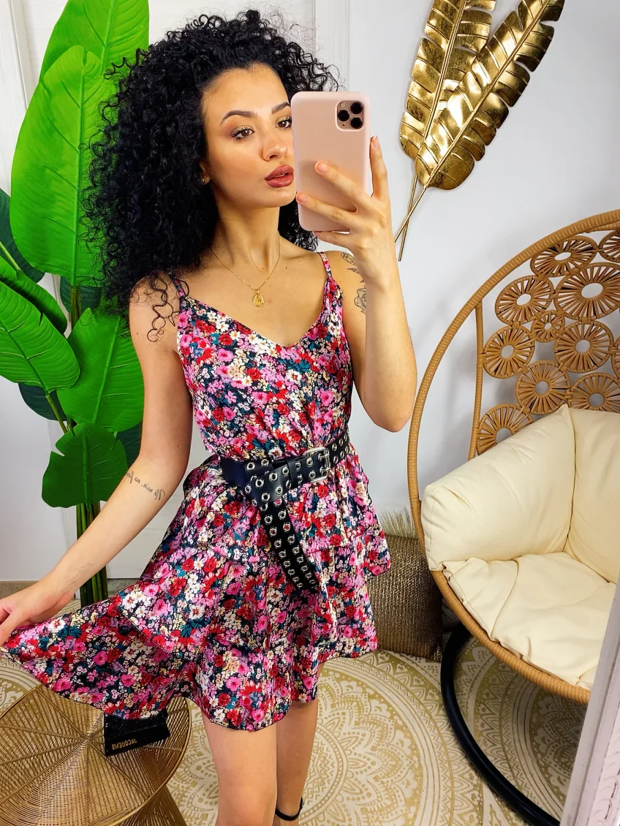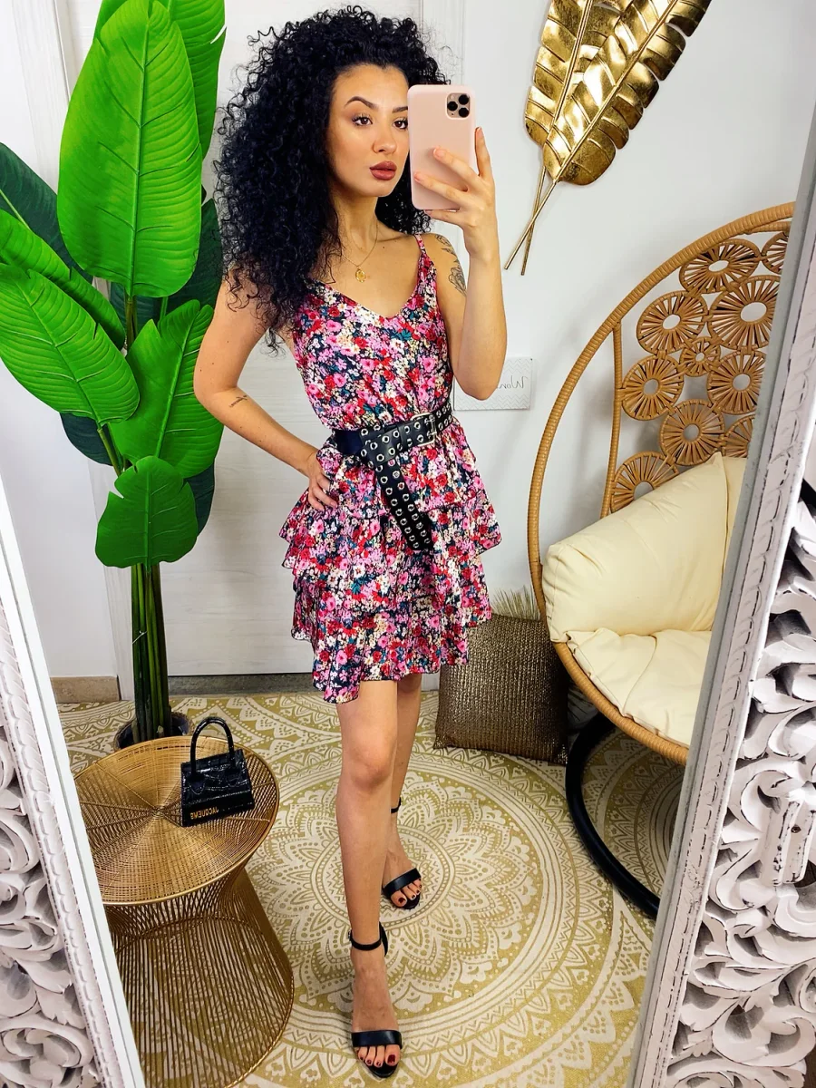 Abito a balze a fiori base nera. Tessuto liscio in raso con tre balze tono su tono. Abbinalo con una cintura in vita.