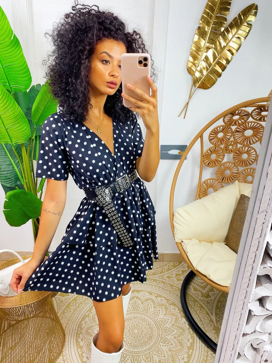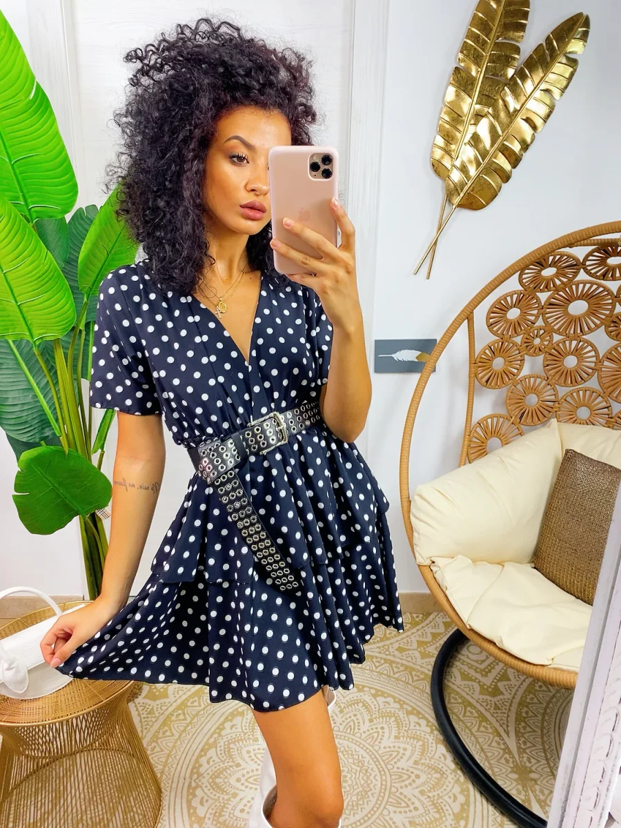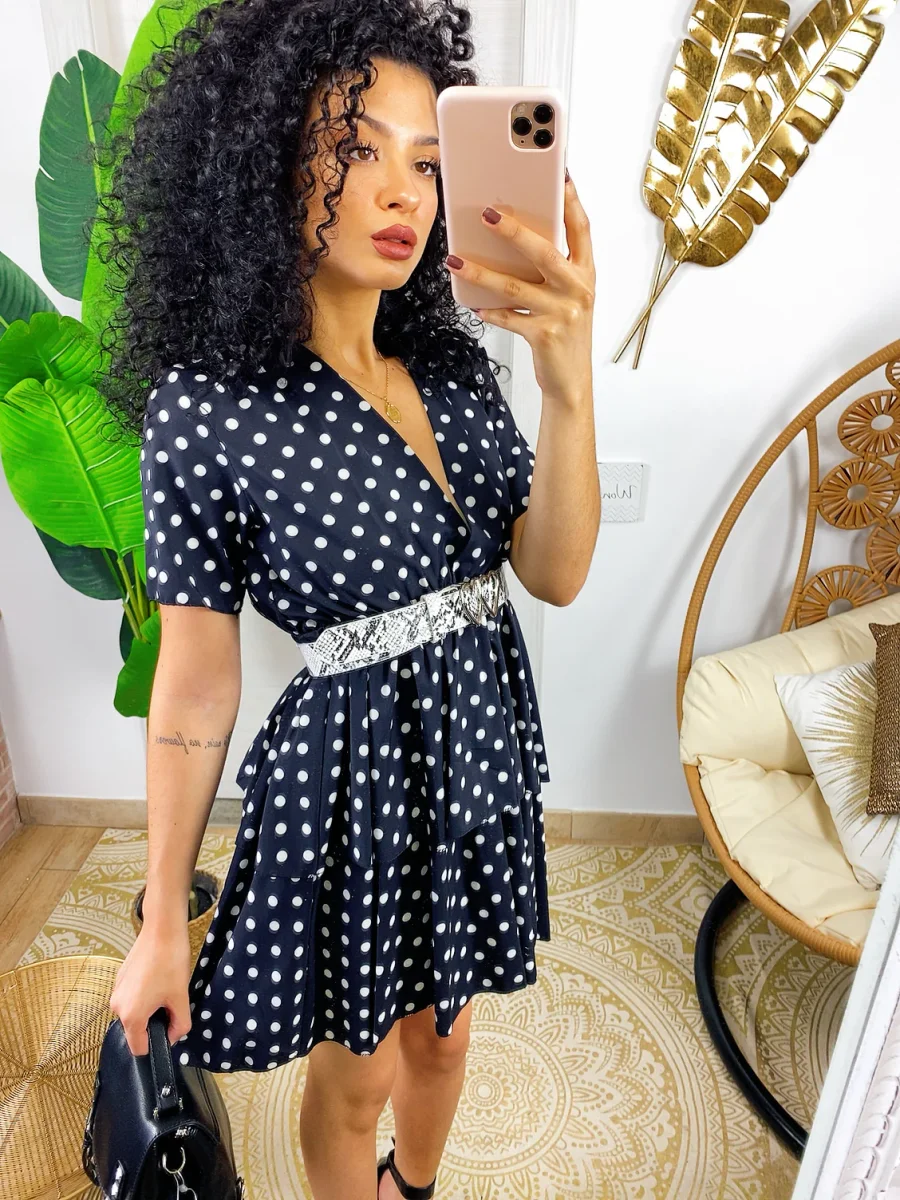 Abito con balze con maxi scollo. Stampa a pois. Tessuto elasticizzato modello corto.