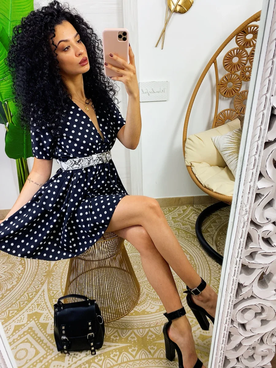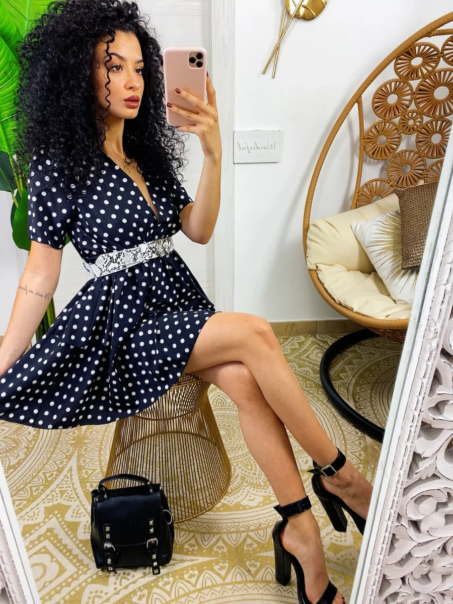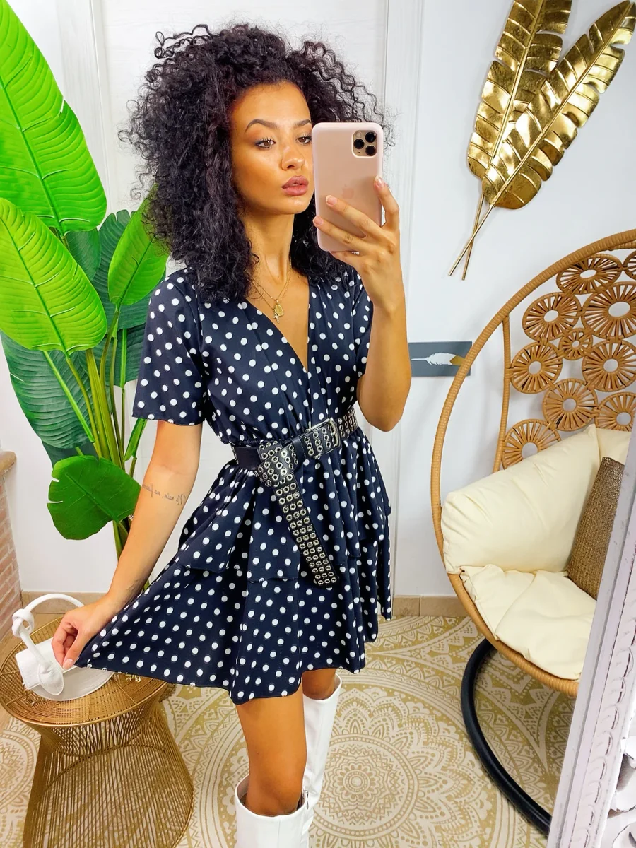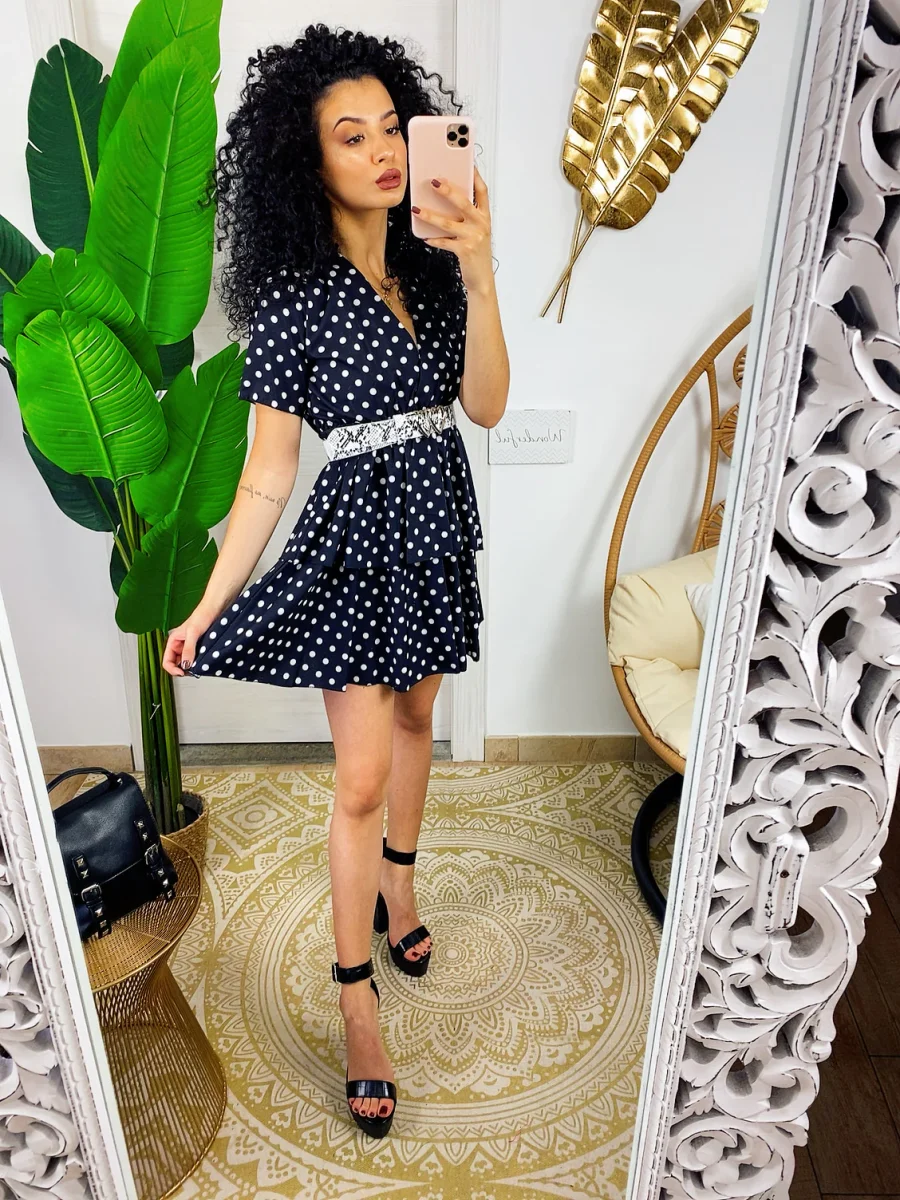 Abito con balze con maxi scollo. Stampa a pois. Tessuto elasticizzato modello corto.