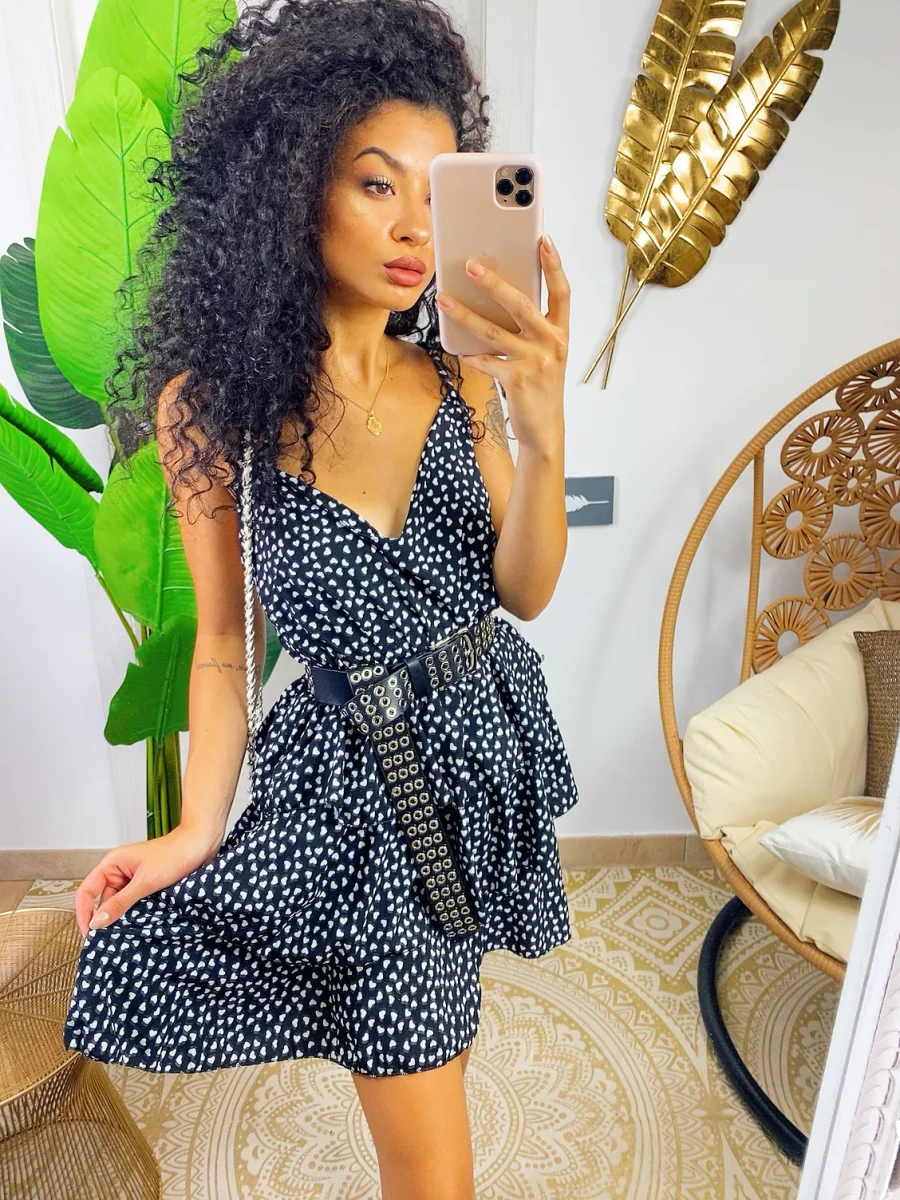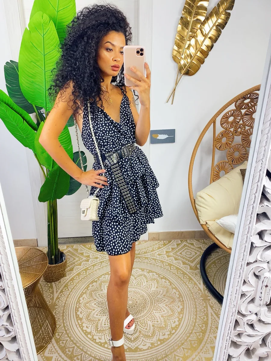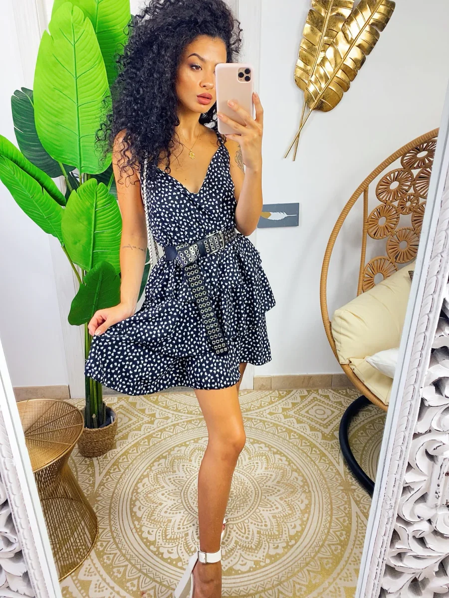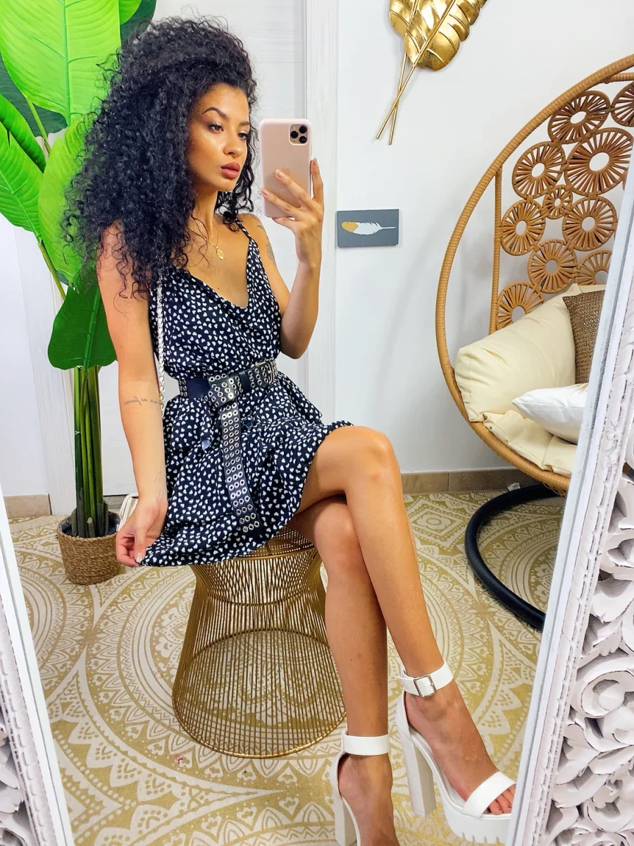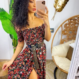 Abito a balze in cotone a bretellina con stampa a fiori sui toni del Fuxia e verdeacqua . Elasticizzato sul petto perciò adattabile a tutte le taglie. Taglio in vita e 3 balze