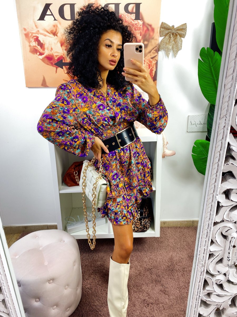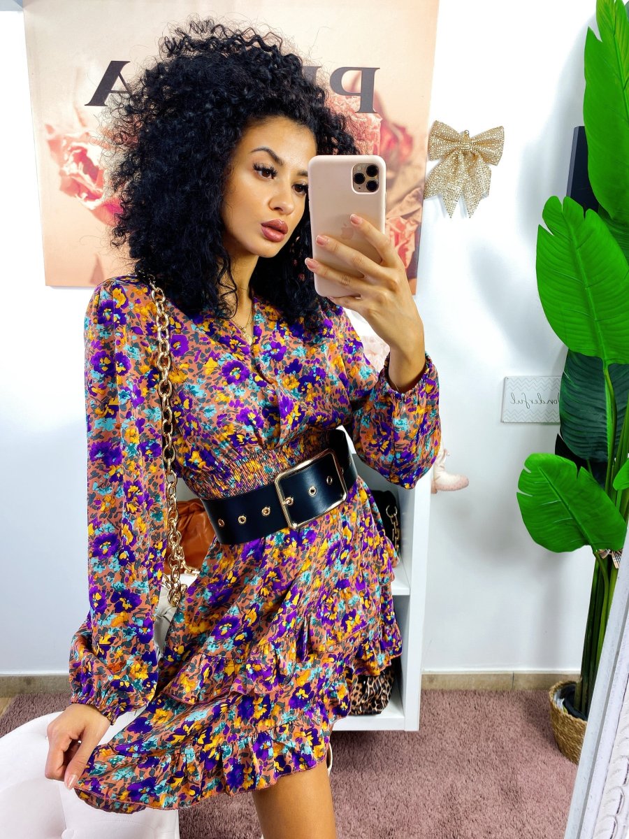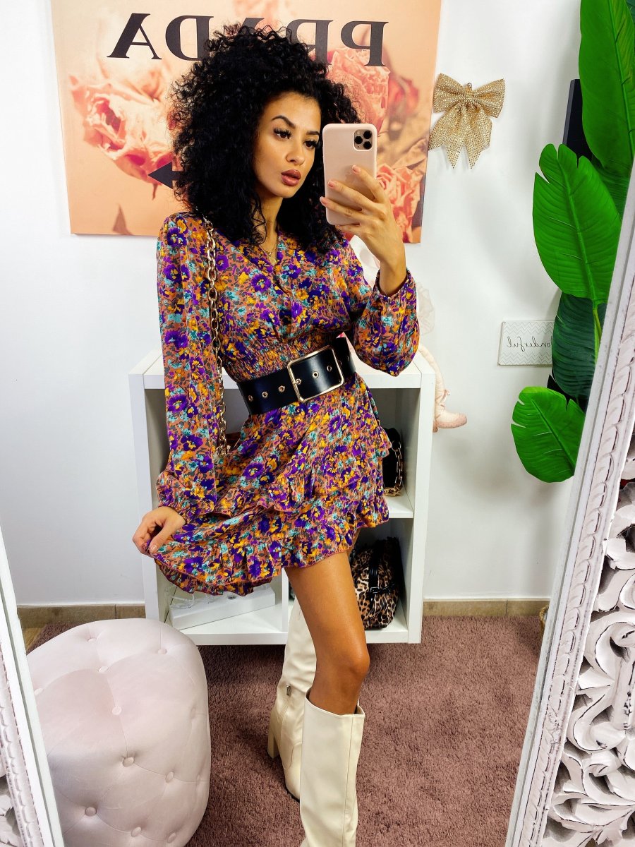 Abito in raso a manica lunga con scollo a V. Gonna a balze e arricciatura in vita.