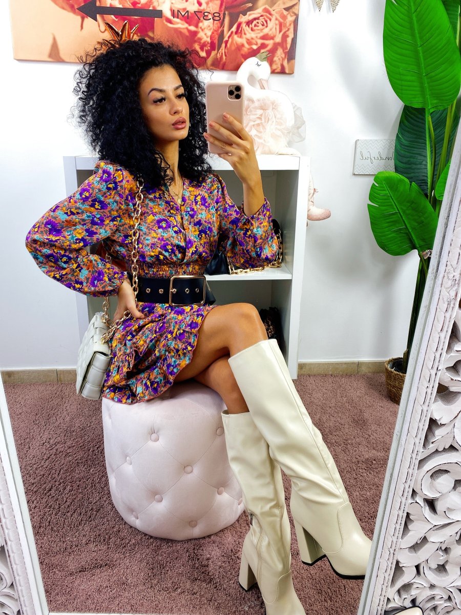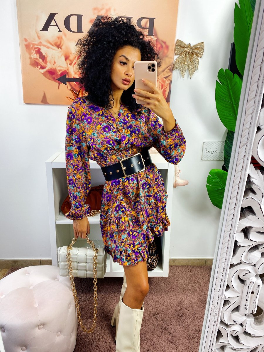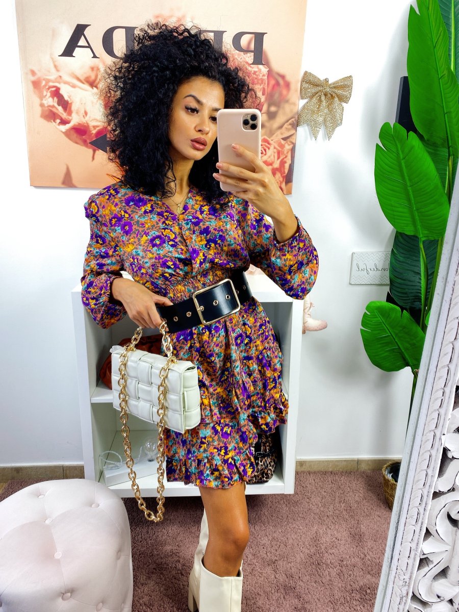 Abito in raso a manica lunga con scollo a V. Gonna a balze e arricciatura in vita.
