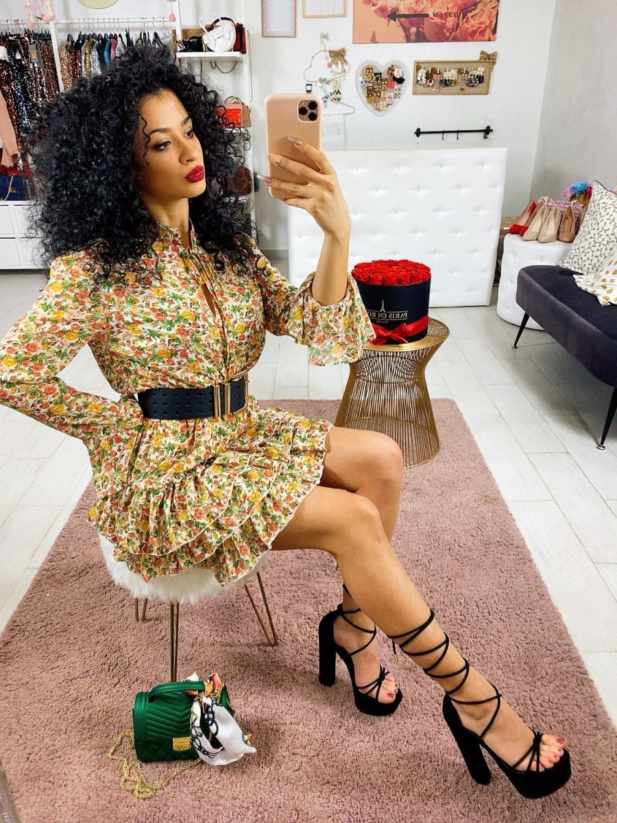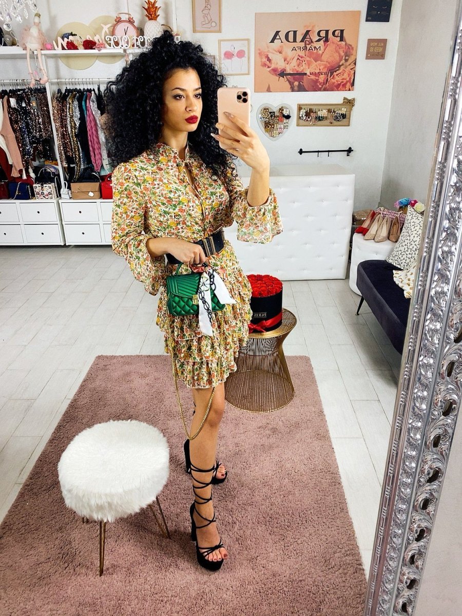 Abito in tessuto leggero con balze sulla gonna. Chiusura con laccetto al collo. Tessuto sfizioso a fantasia floreale.