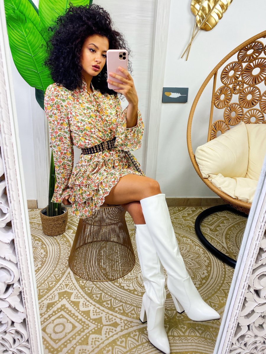 Abito a balze con fiori base bianca