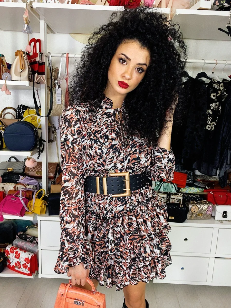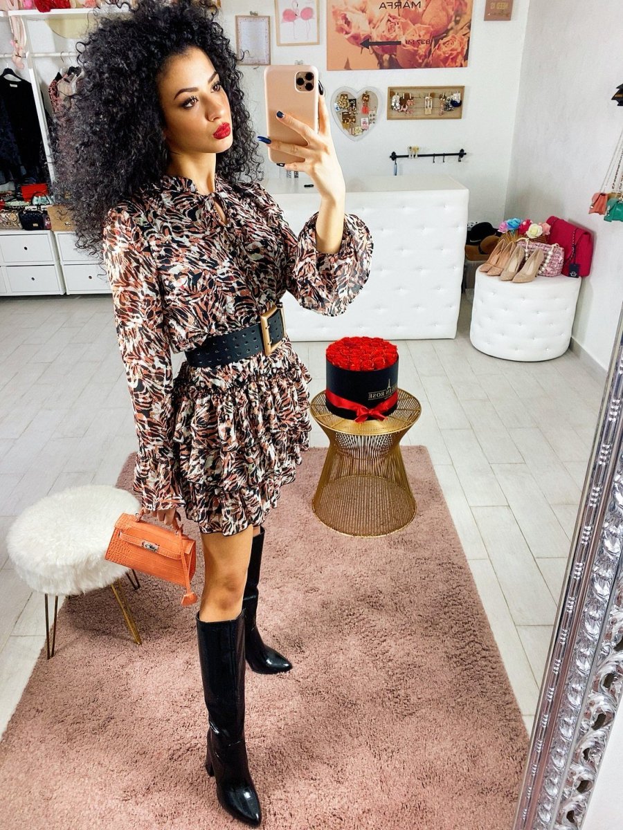Abito in tessuto leggero con balze sulla gonna. Chiusura con laccetto al collo. Tessuto sfizioso a fantasia floreale.