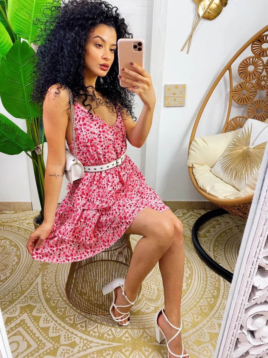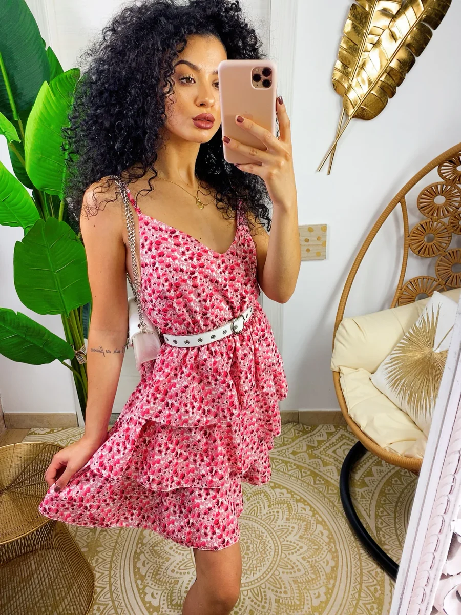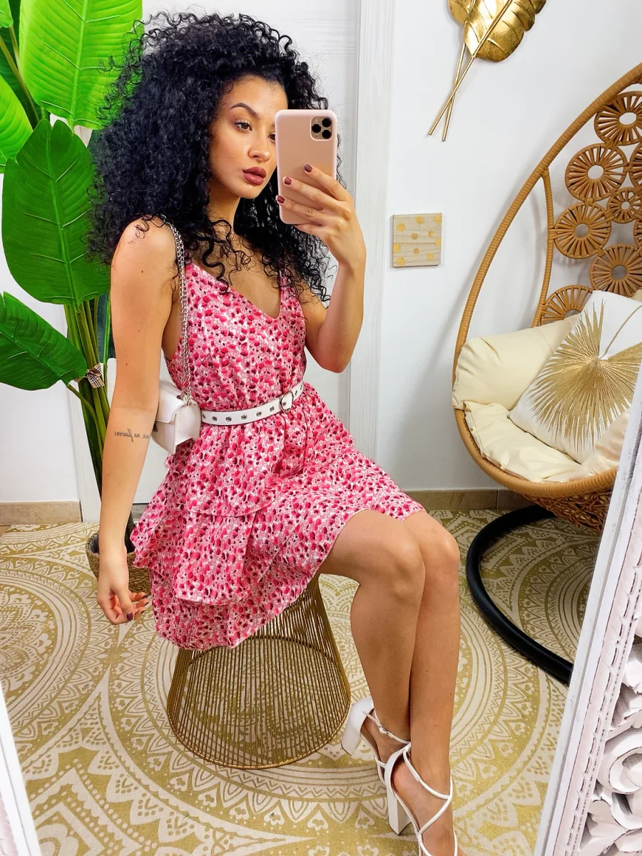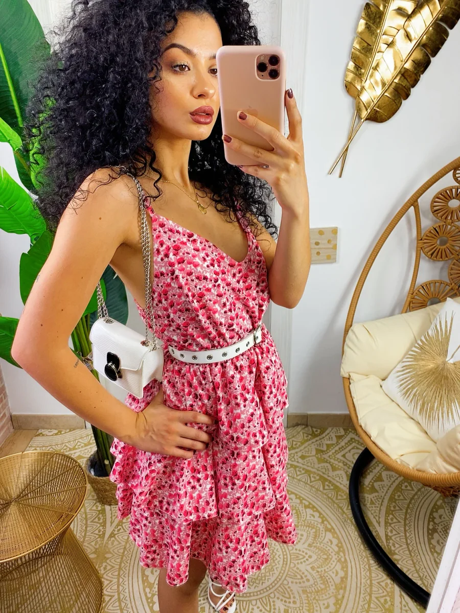 Abito a balze in cotone a bretellina con stampa a fiori sui toni del Fuxia. Elasticizzato sul petto perciò adattabile a tutte le taglie. Taglio in vita e 3 balze