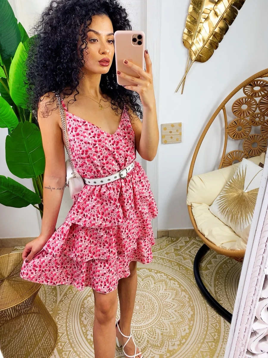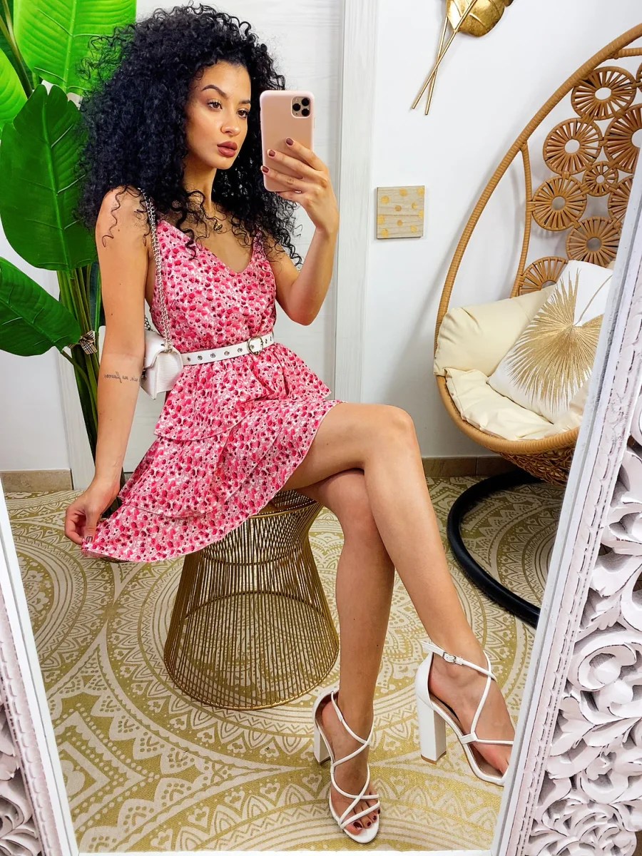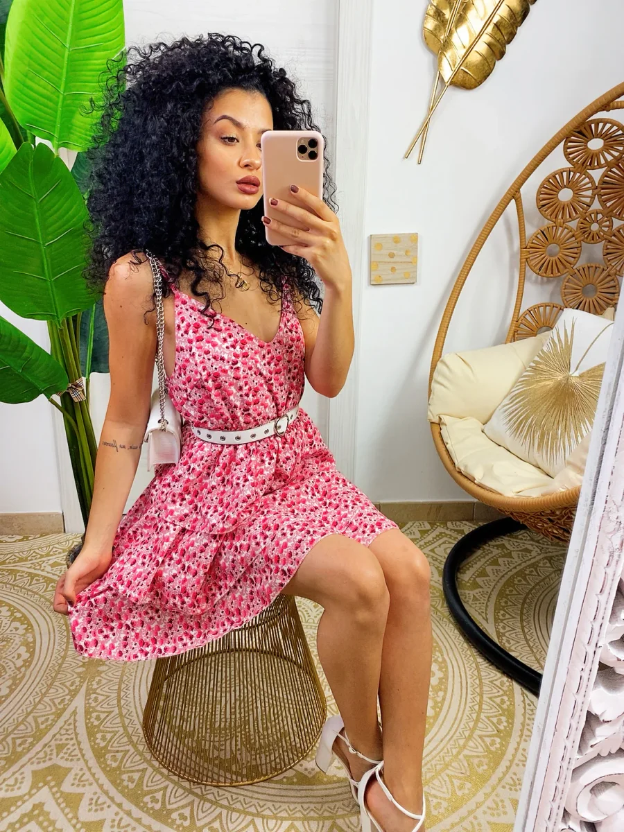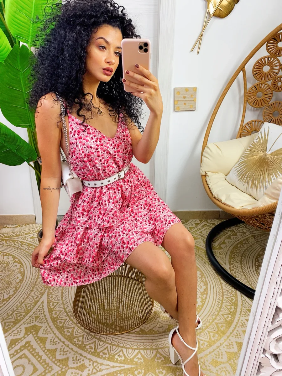 Abito a balze in cotone a bretellina con stampa a fiori sui toni del Fuxia. Elasticizzato sul petto perciò adattabile a tutte le taglie. Taglio in vita e 3 balze