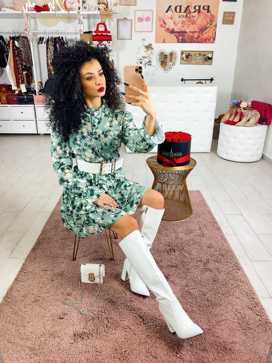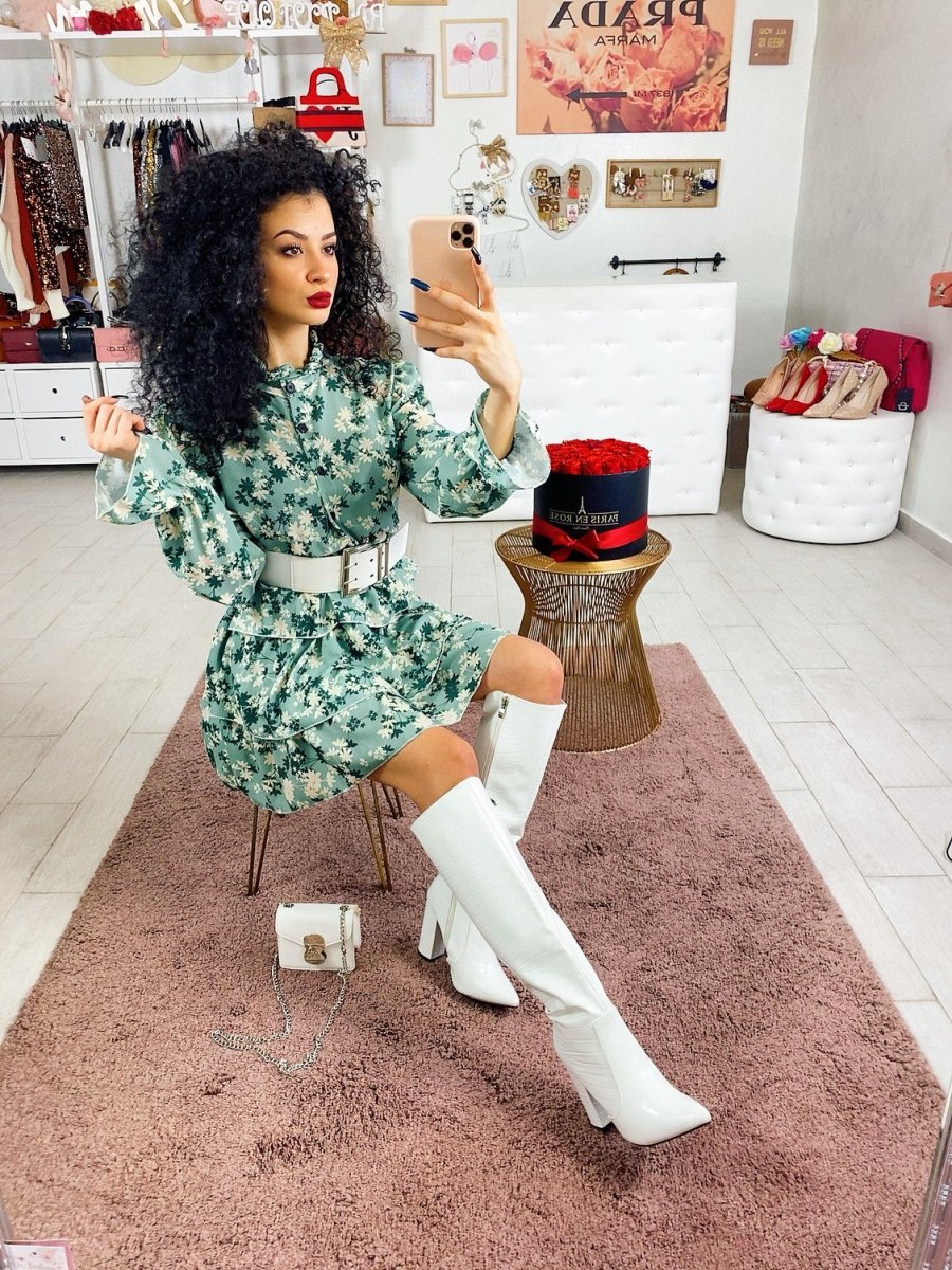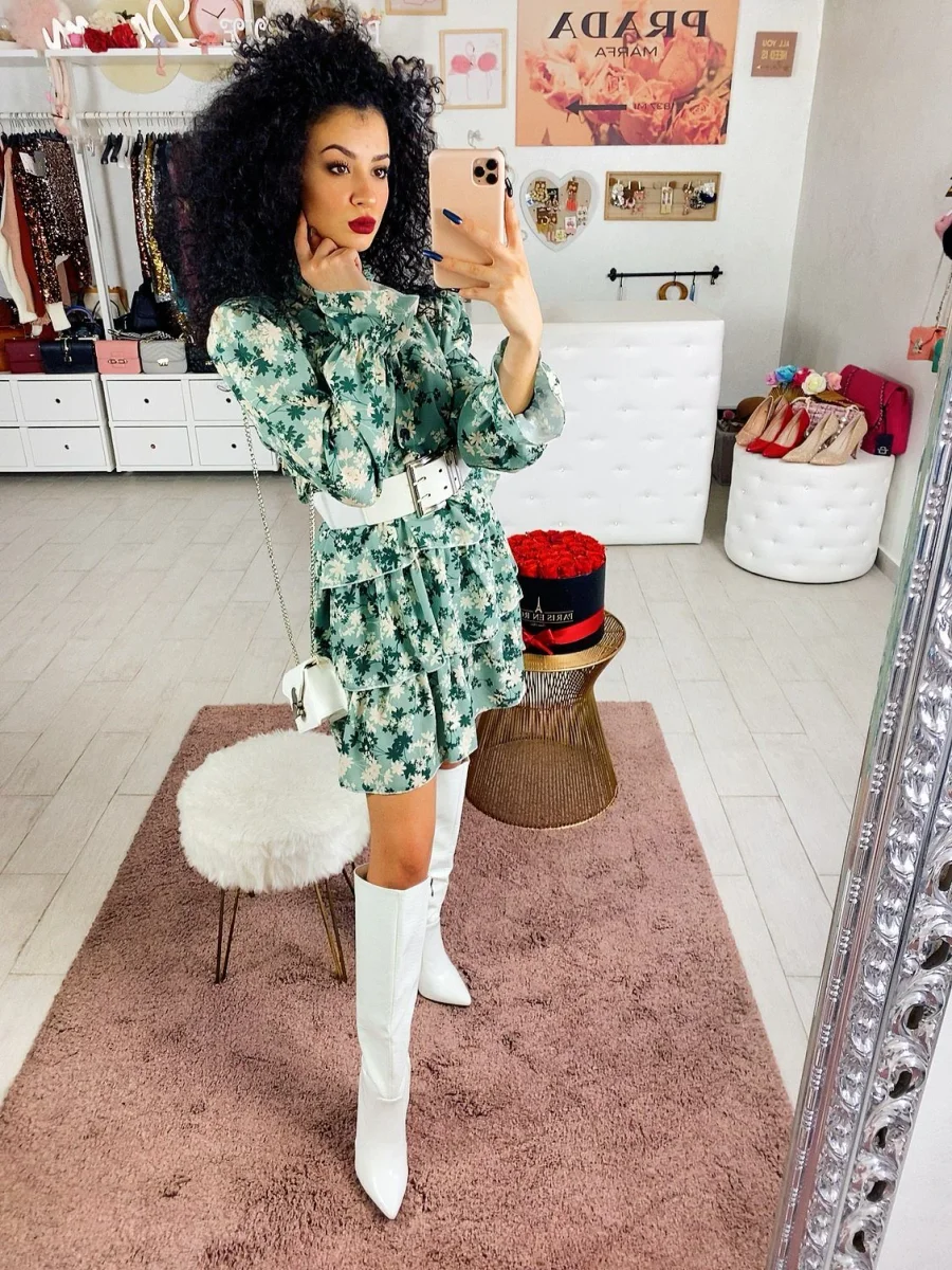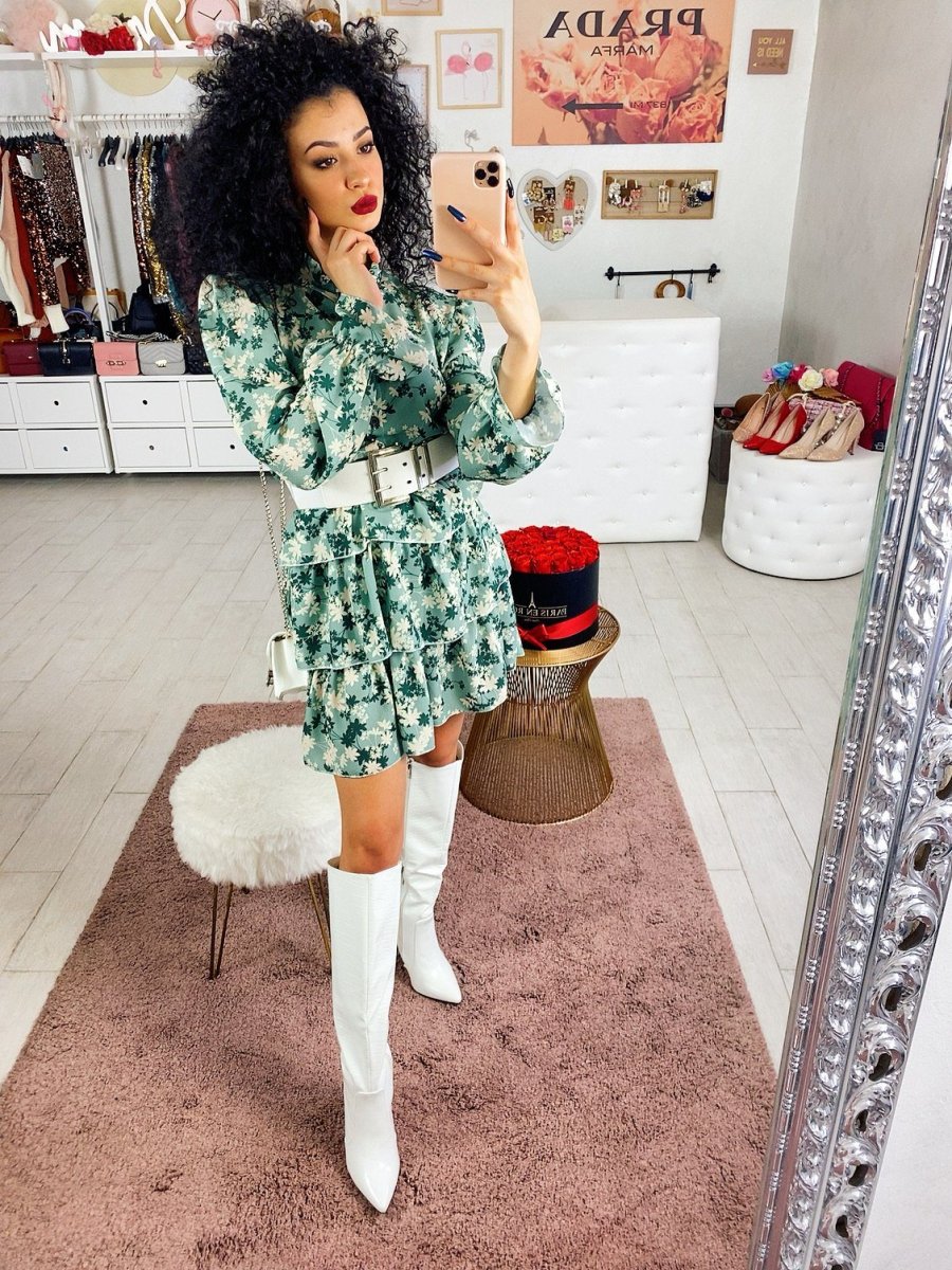 Abito in tessuto leggero con balze. Chiusura con bottoncini nel davanti. Manica morbida.