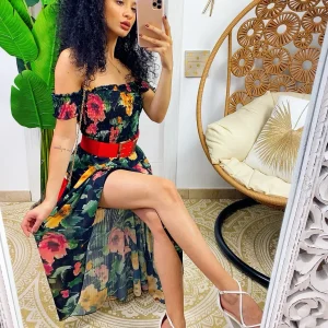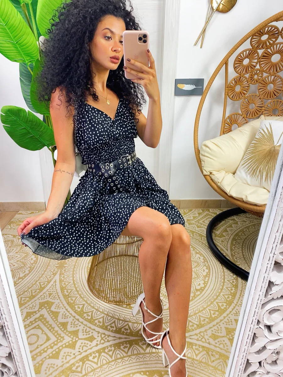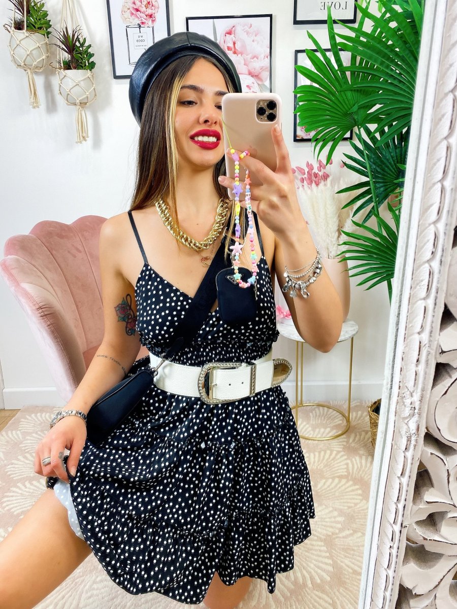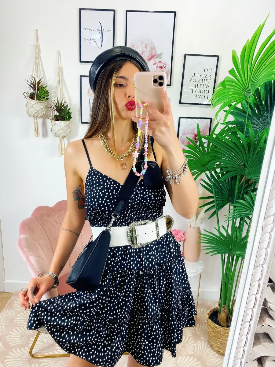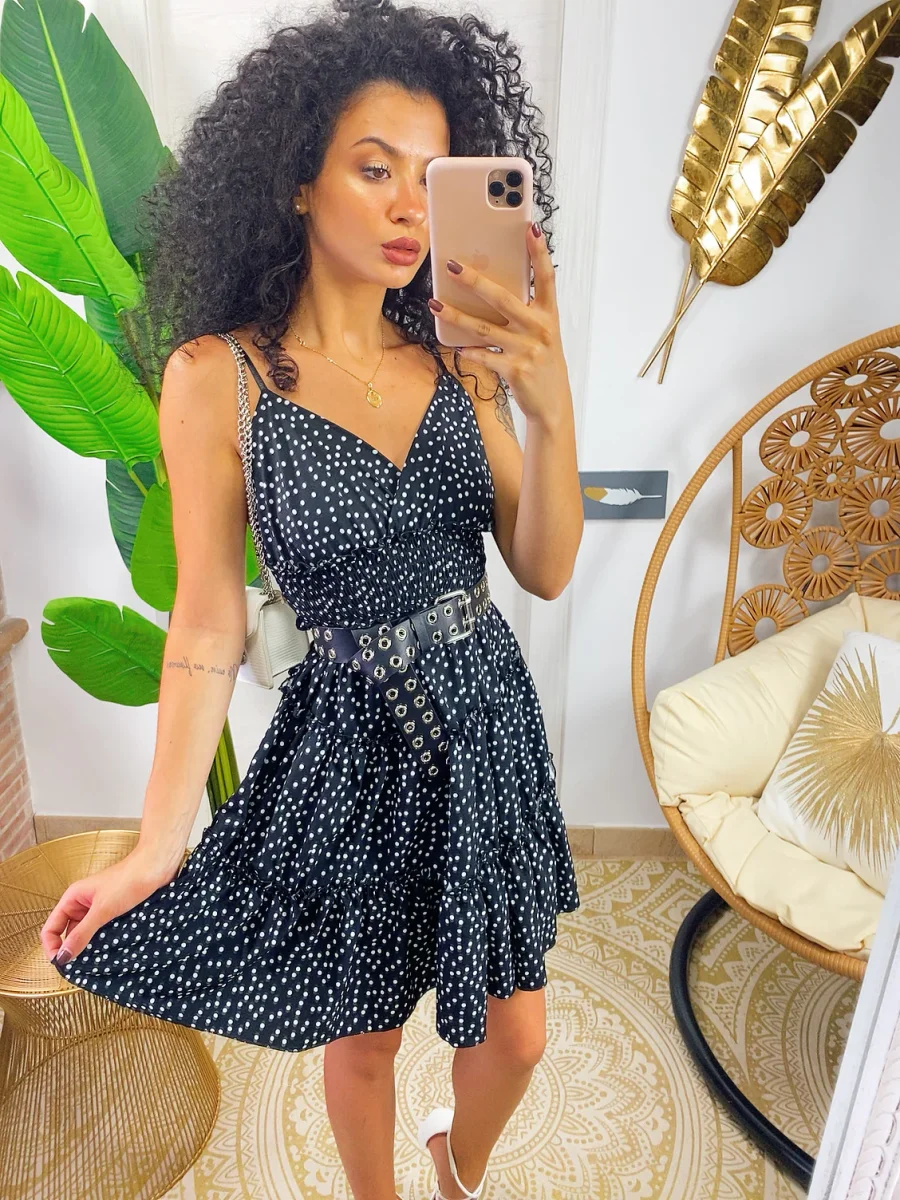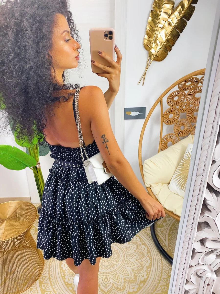 Abito a balze in cotone a bretellina con stampa a pois. Elasticizzato sul petto e bretelline regolabili. Taglio in vita