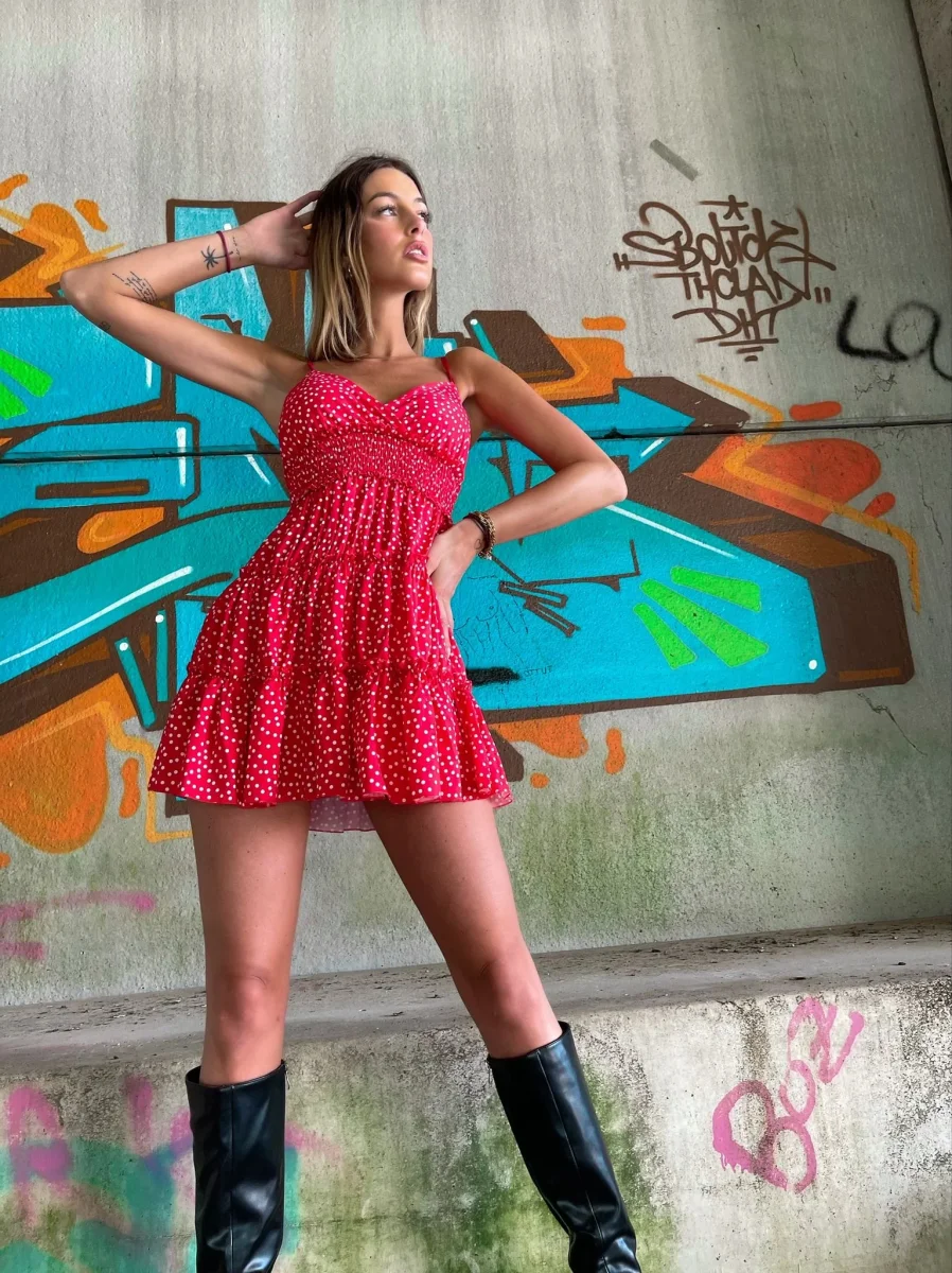Abito a balze in cotone a bretellina con stampa a pois. Elasticizzato sul petto e bretelline regolabili. Taglio in vita
