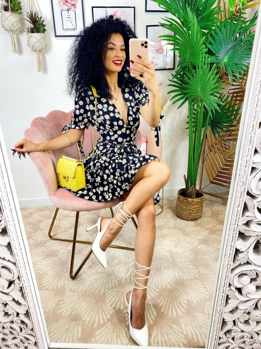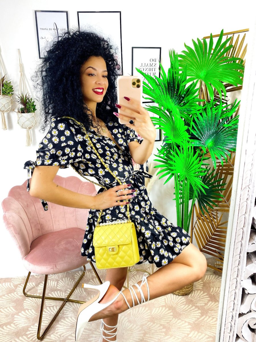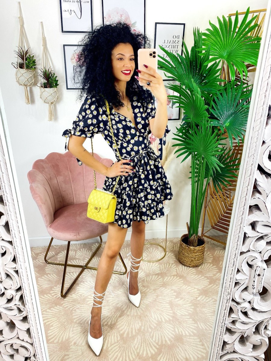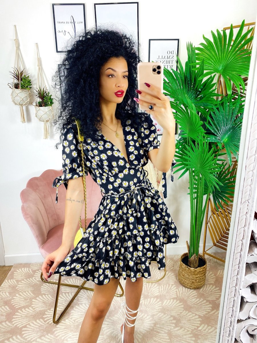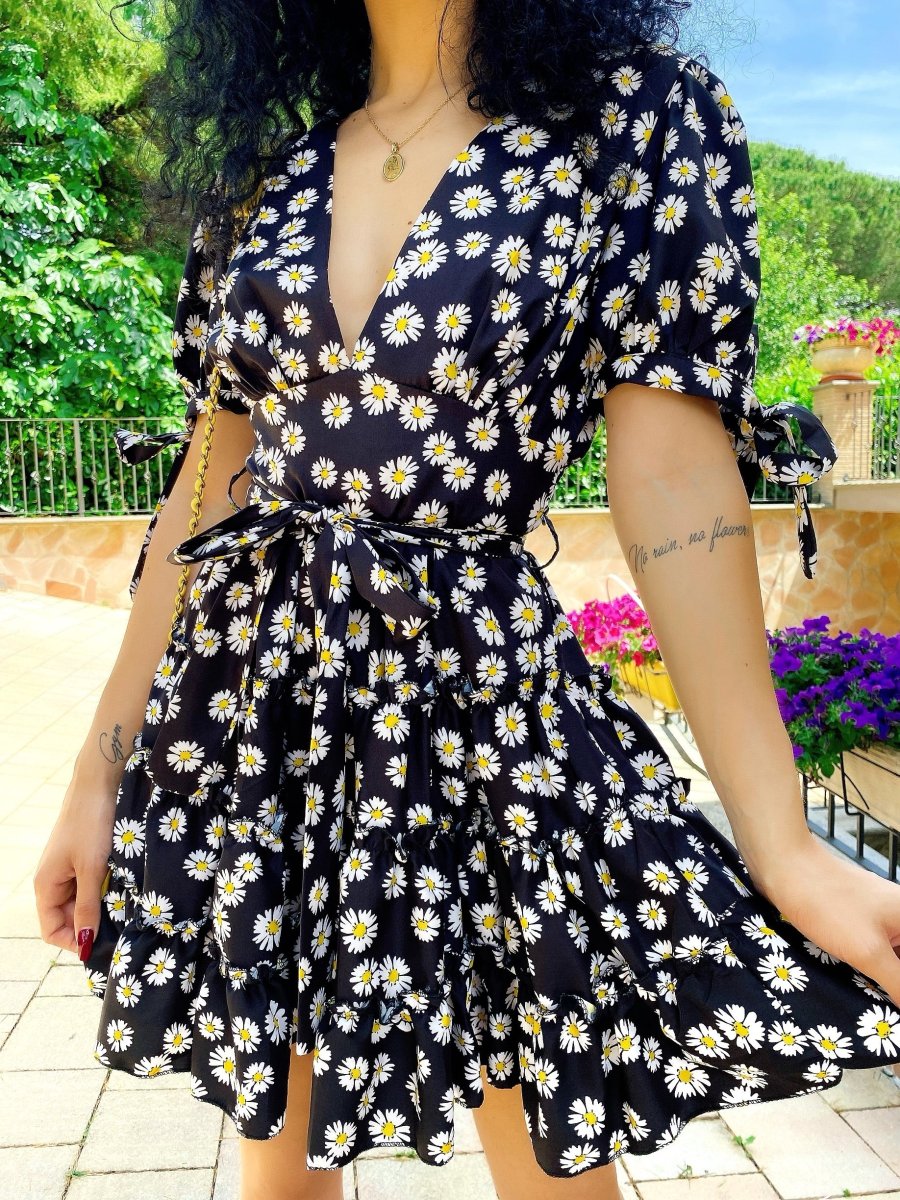 Abito morbido a balze con margherite, elasticizzato e comodo.