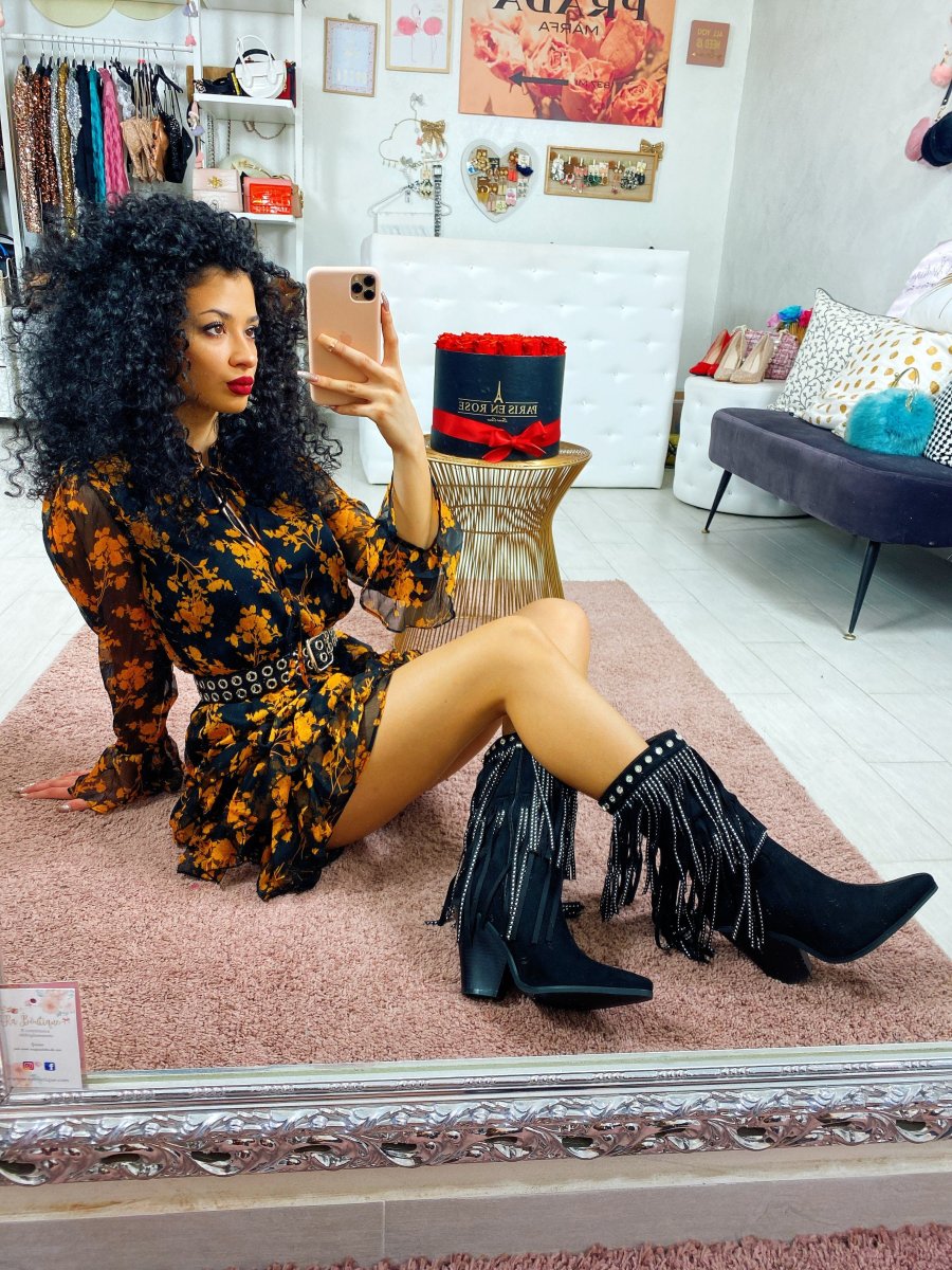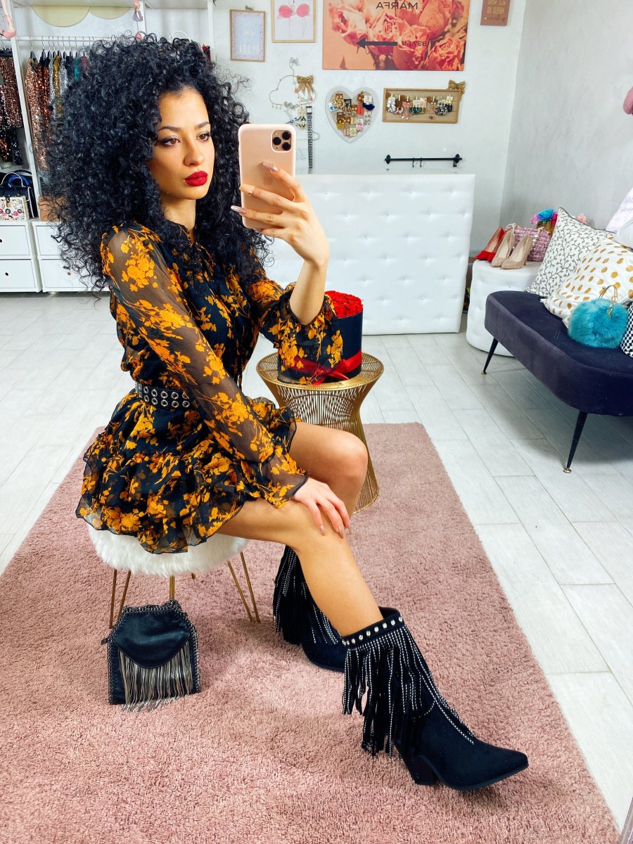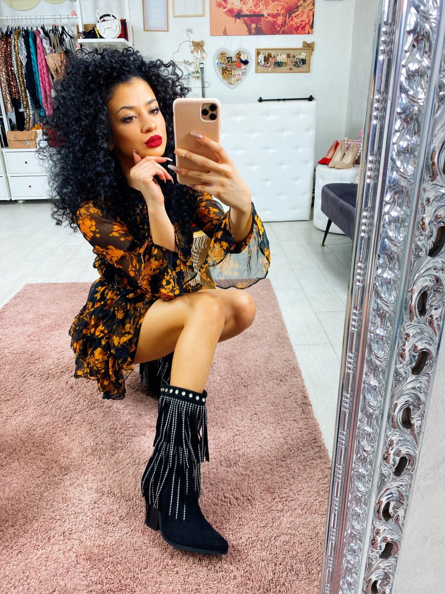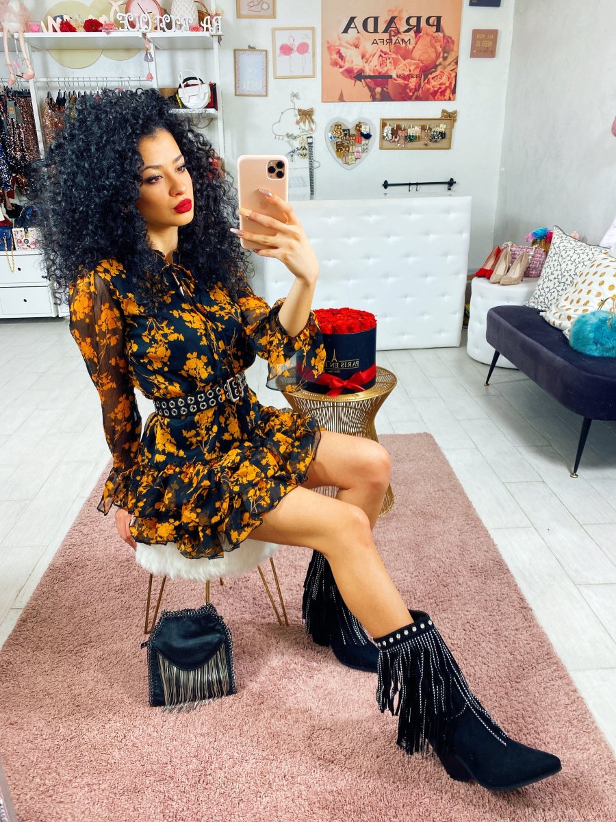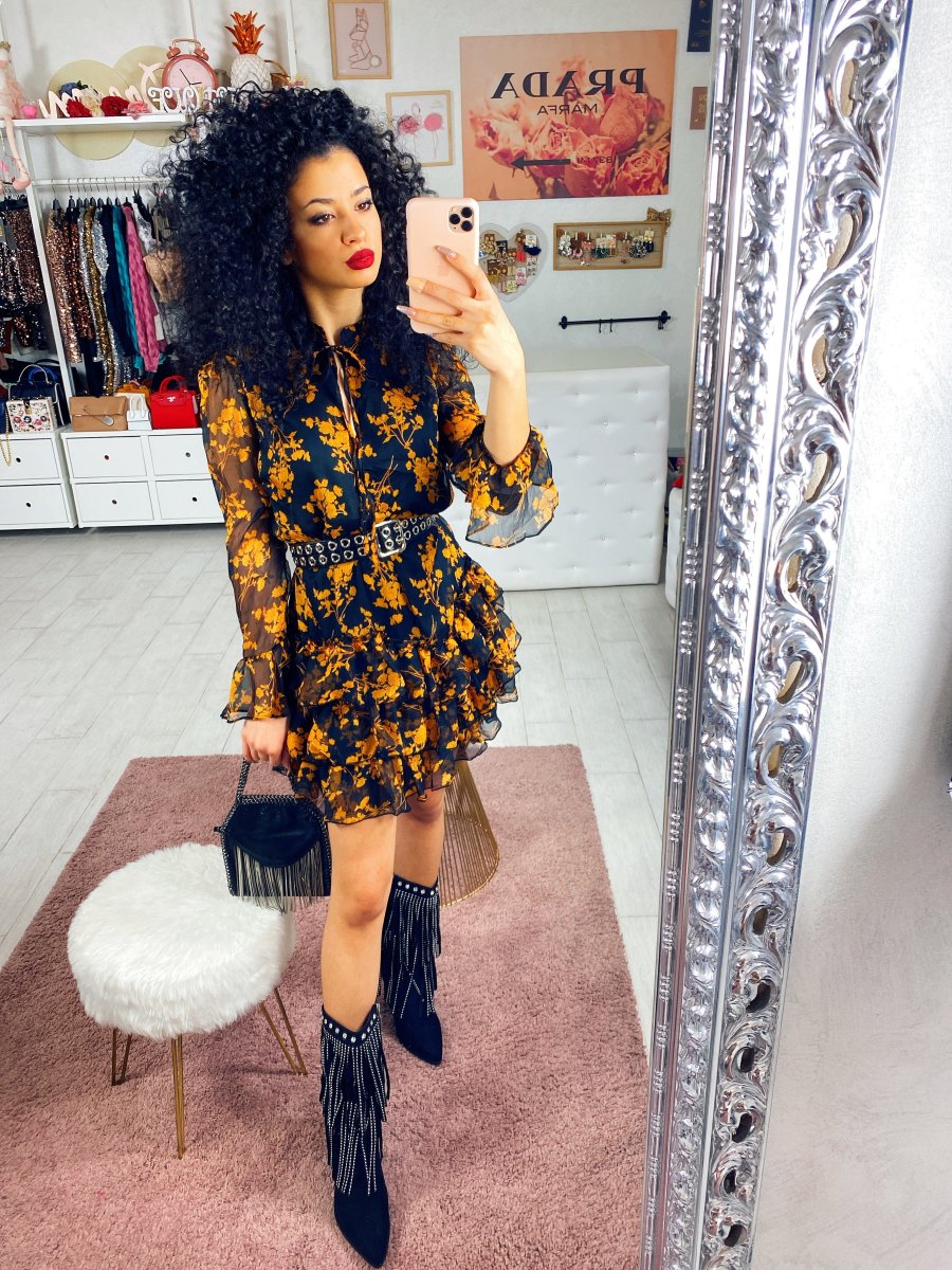 Abito in tessuto leggero con balze sulla gonna. Chiusura con laccetto al collo. Tessuto sfizioso a fantasia floreale.