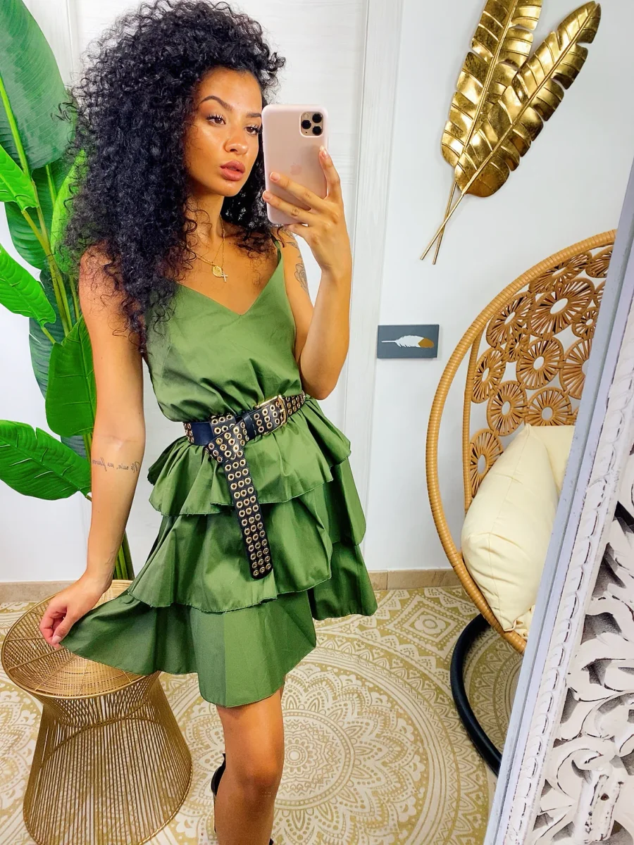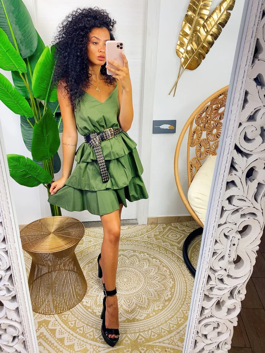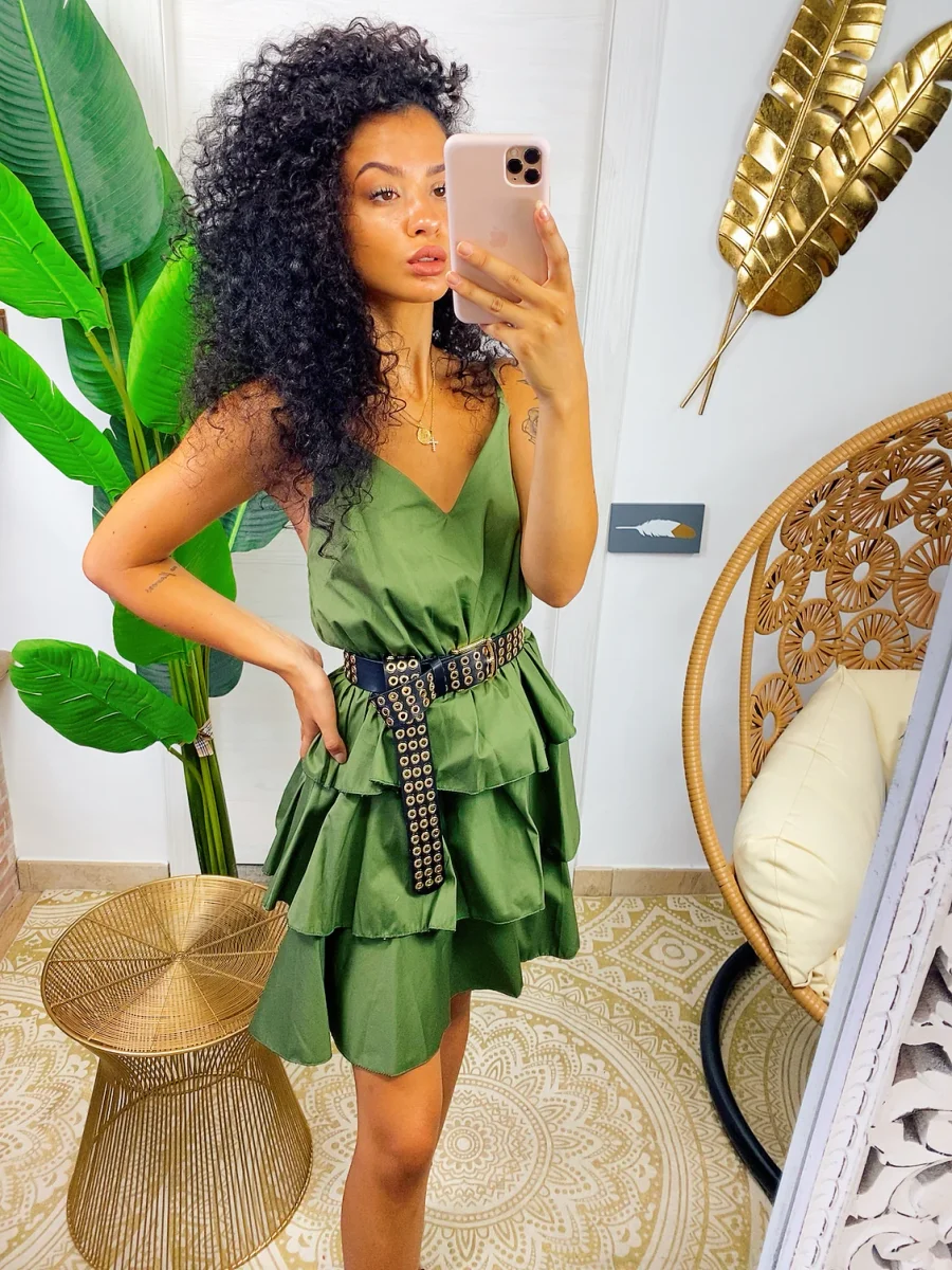 Abito a balze in cotone verde Elasticizzato sul petto perciò adattabile a tutte le taglie.