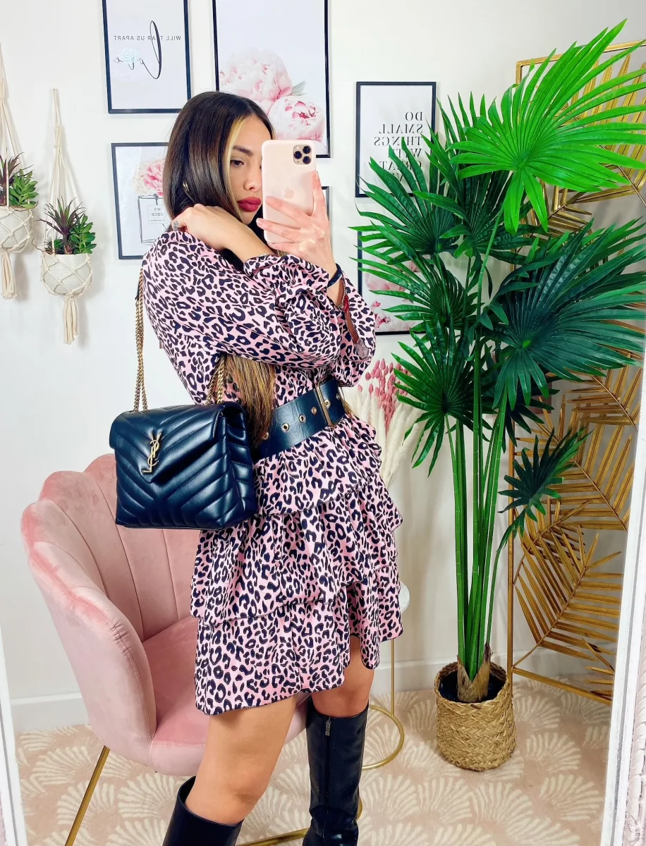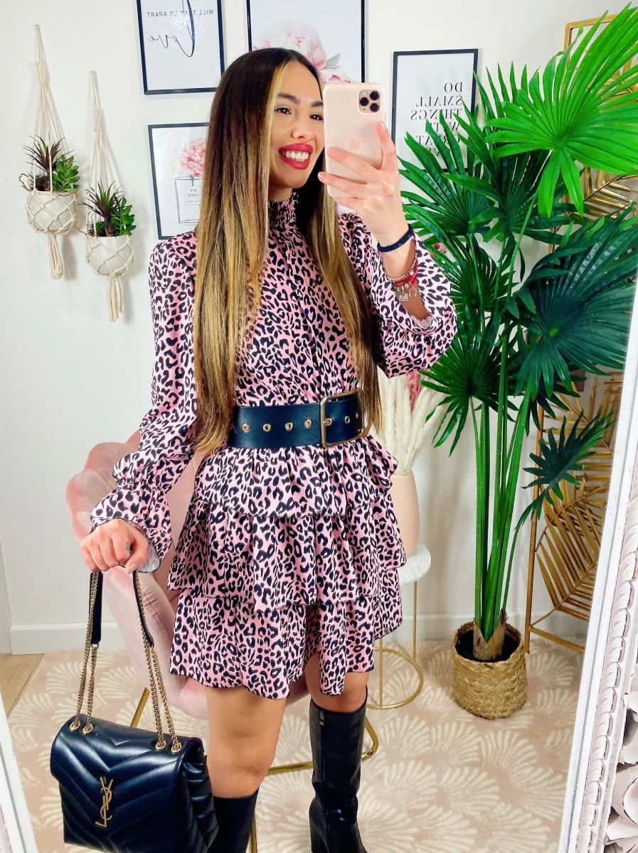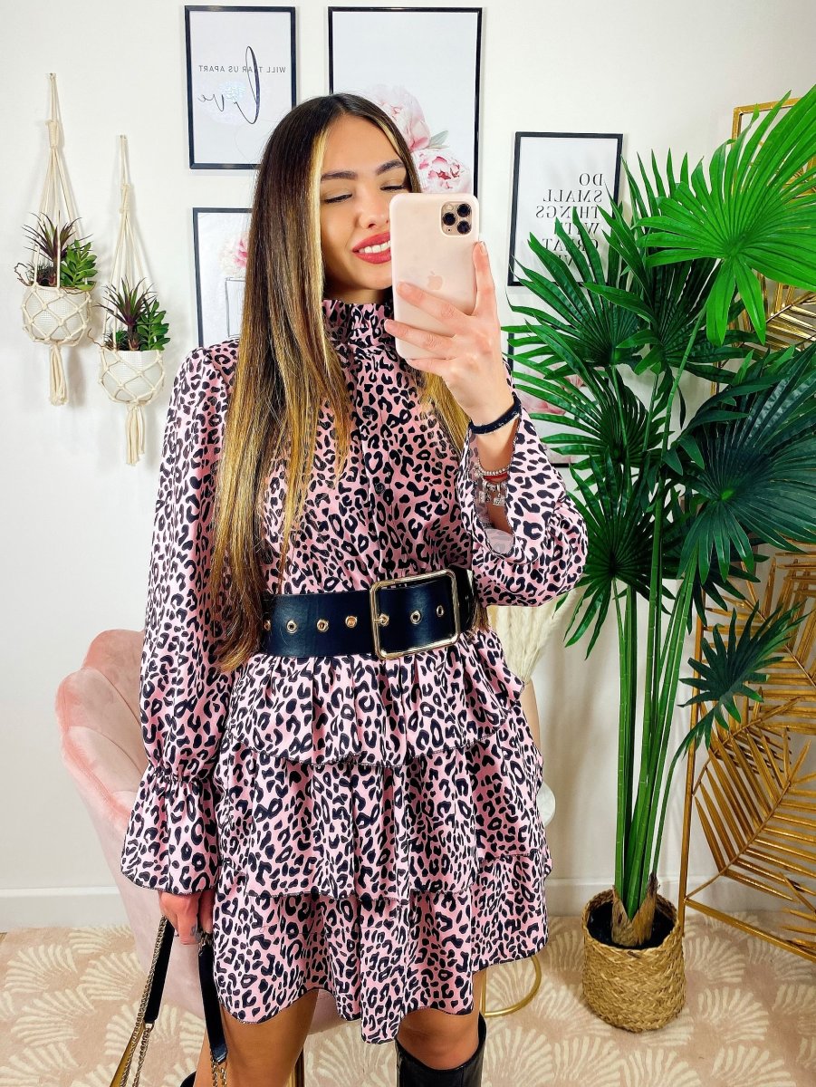 Abito con stampa a fantasia a balze e collettò coreana. Manica lunga tessuto velato con polsino ampio.