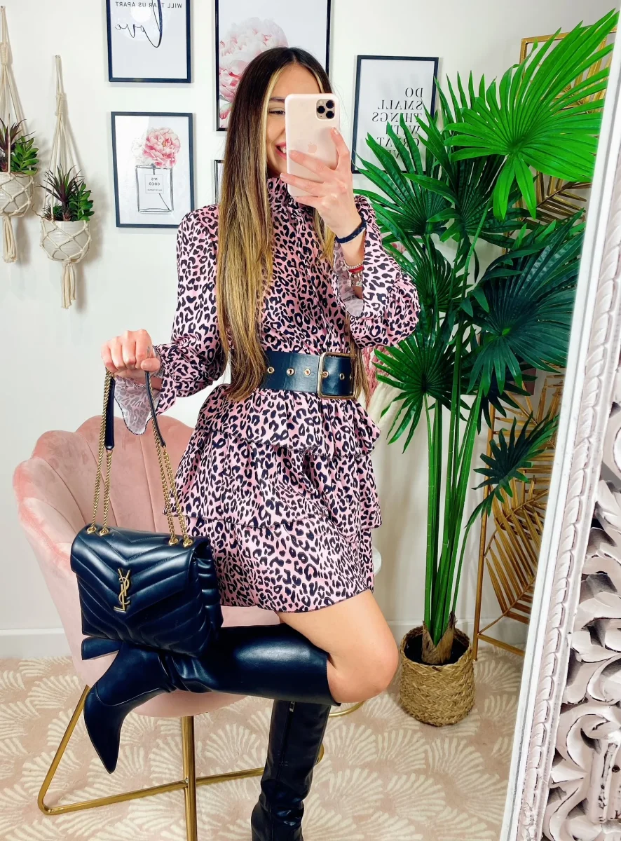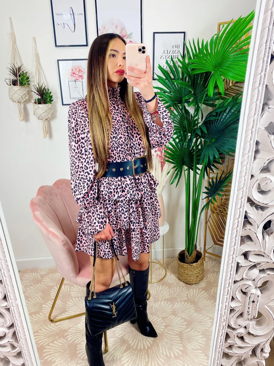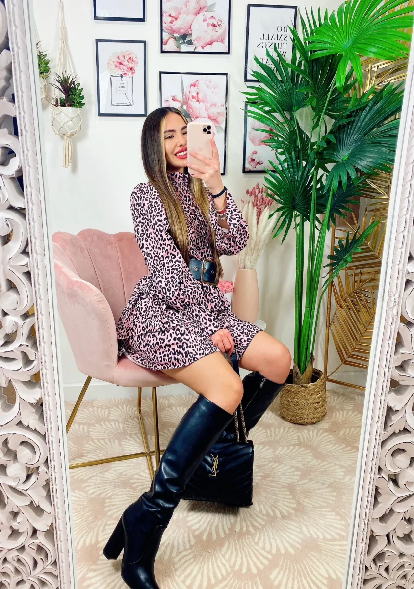Abito con stampa a fantasia a balze e collettò coreana. Manica lunga tessuto velato con polsino ampio.