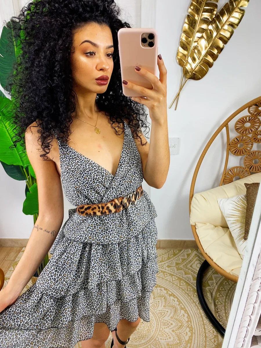 Abito leggero foderato in trama animalier. Scollo a V, balze e taglio in vita.