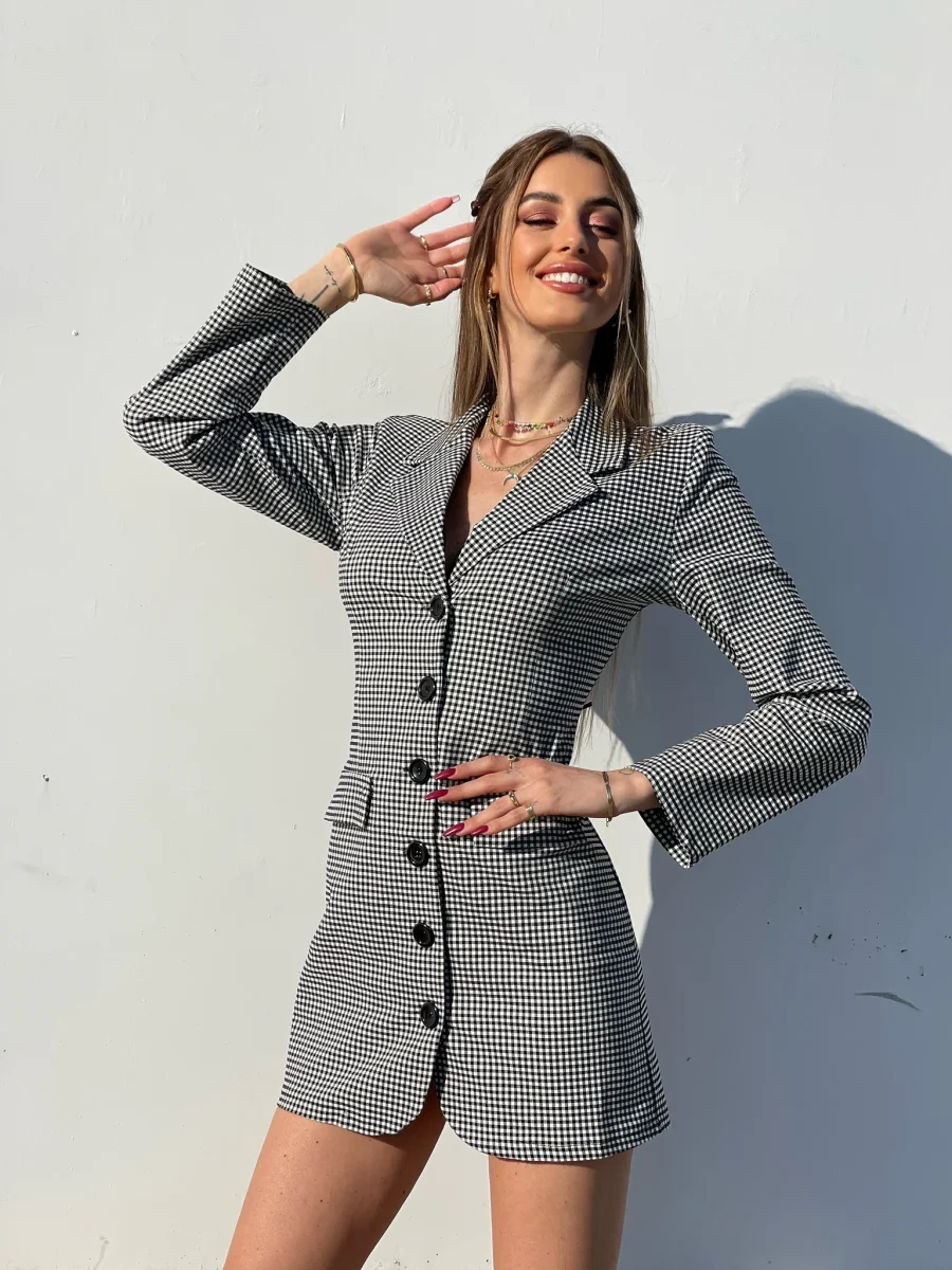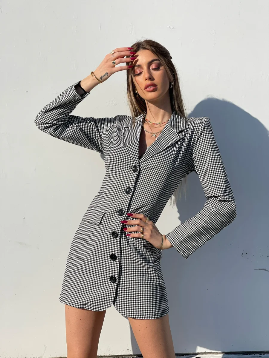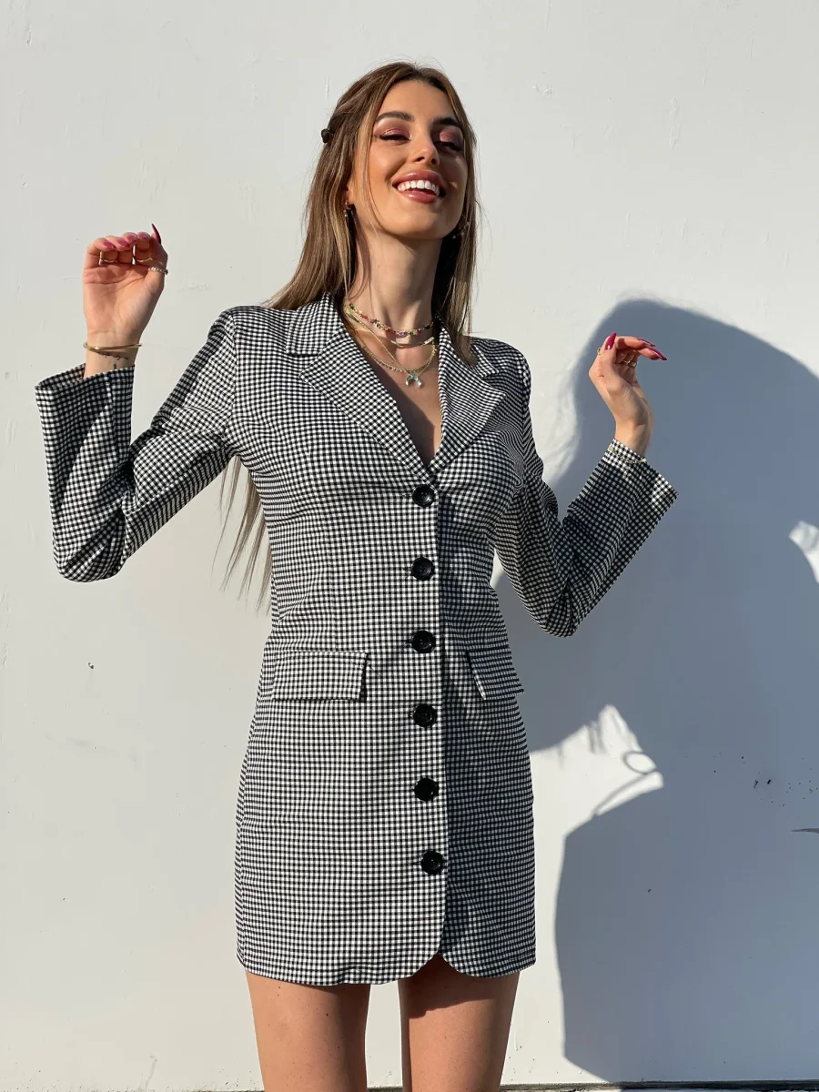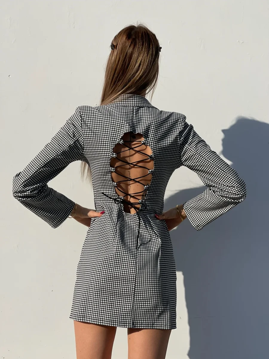 Abito a blazer a quadri bianco e nero schiena aperta incrociata con bottoni neri sul davanti.