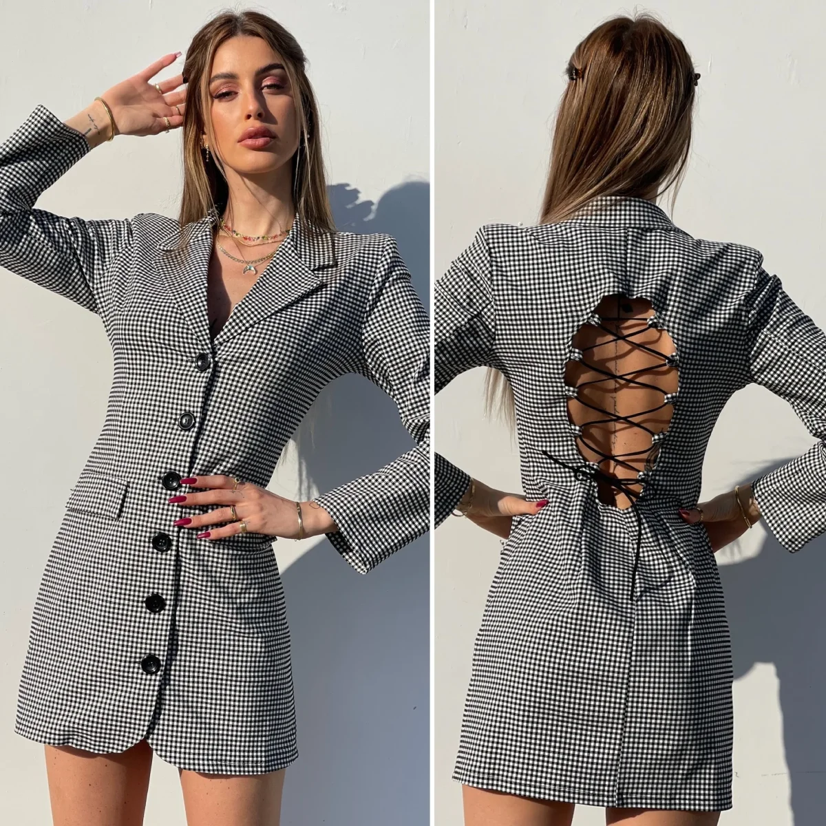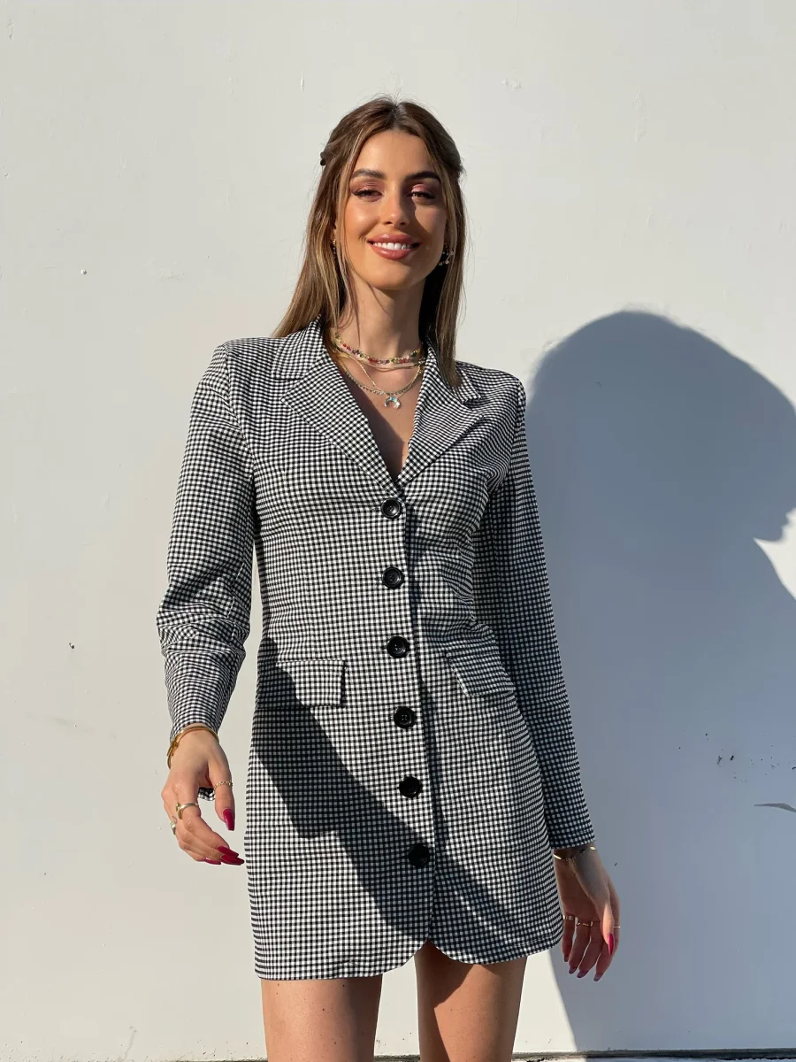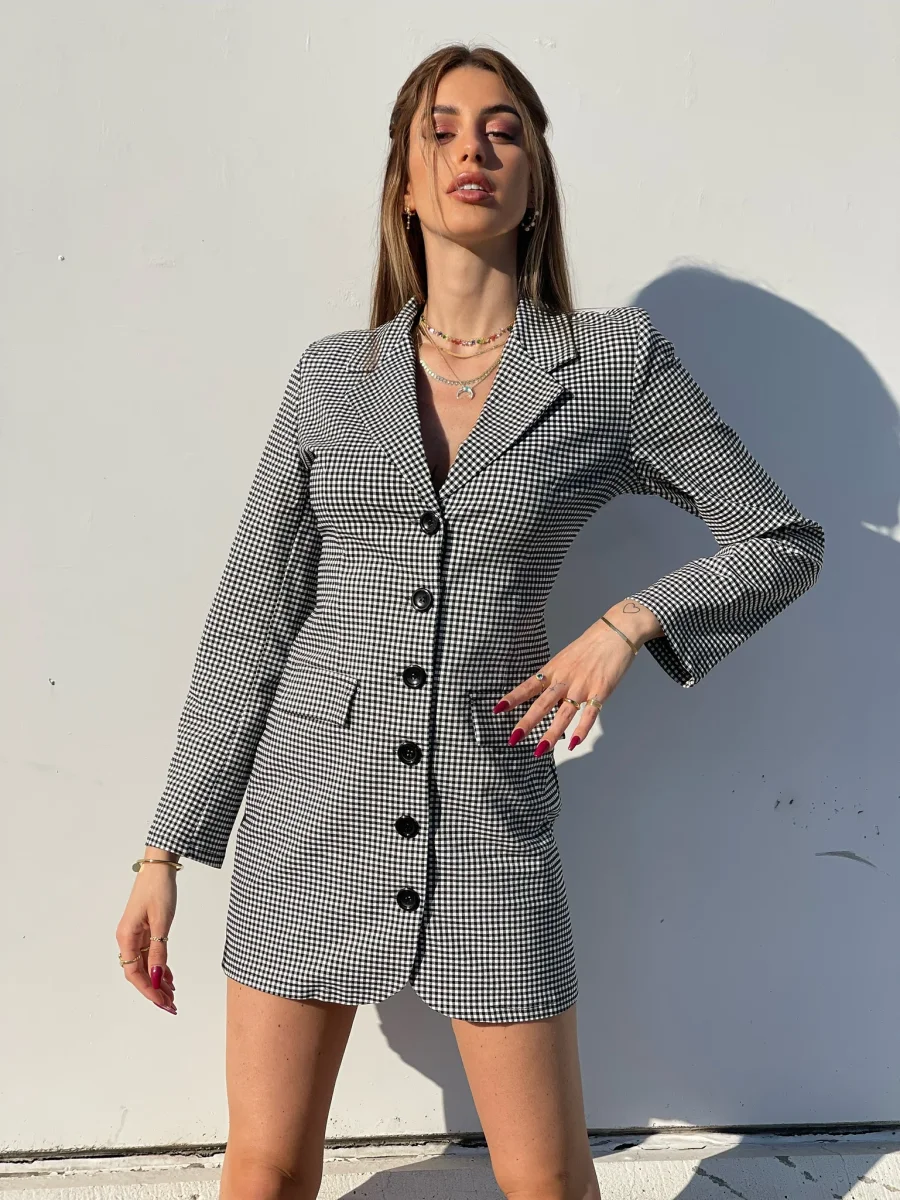 Abito a blazer a quadri bianco e nero schiena aperta incrociata con bottoni neri sul davanti.