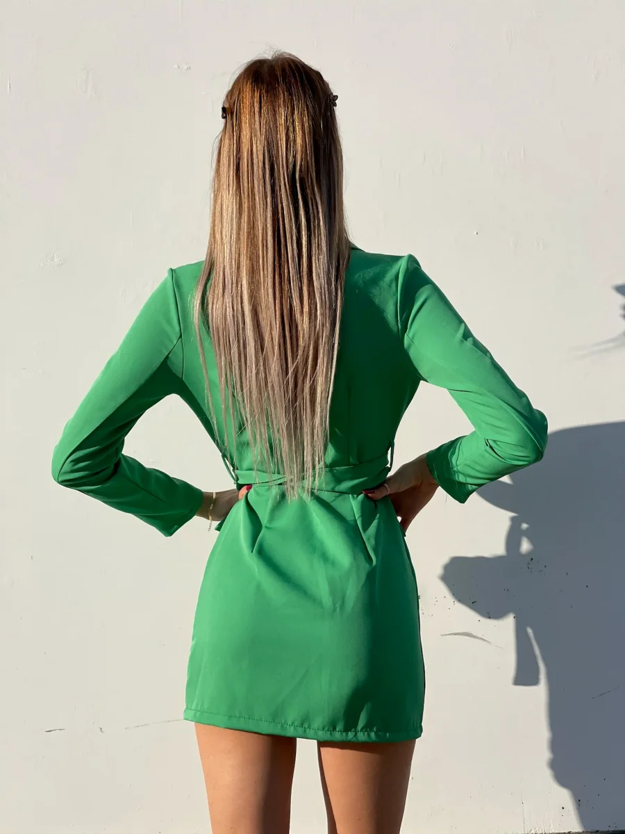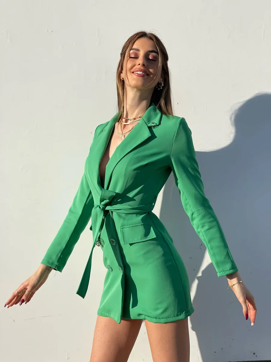 Abito a blazer in un colore acceso con dettagli oro a cerchi, cintura inclusa .