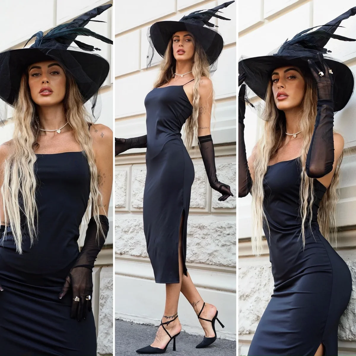 Abito a bretellina in tessuto stretch elasticizzato con spacchetto sul fondo