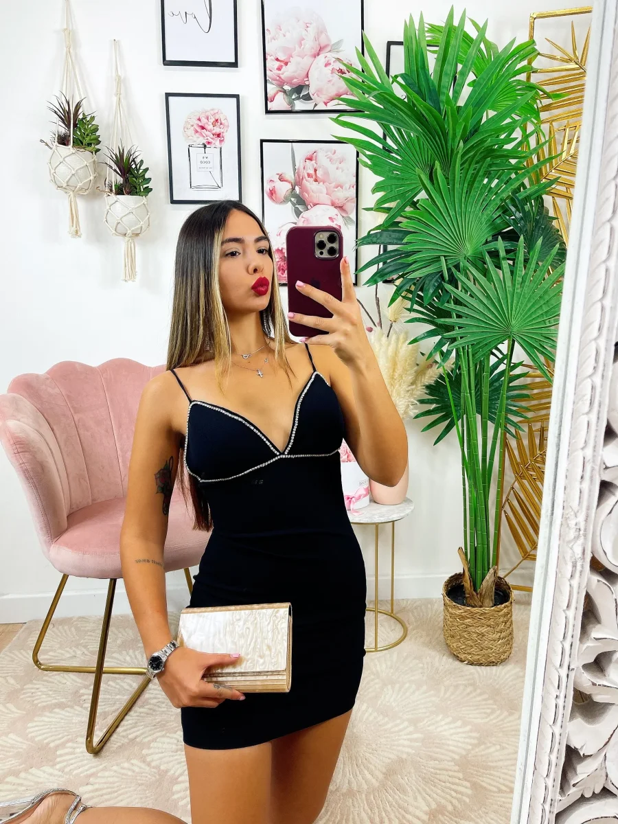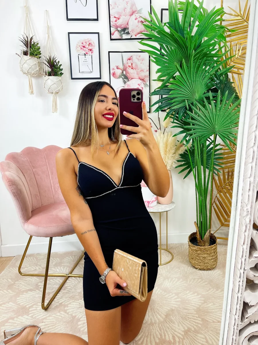 Abito a bretellina con strass, chiusura posteriore e bretelline elasticizzate, è un tessuto elasticizzato e comodo.