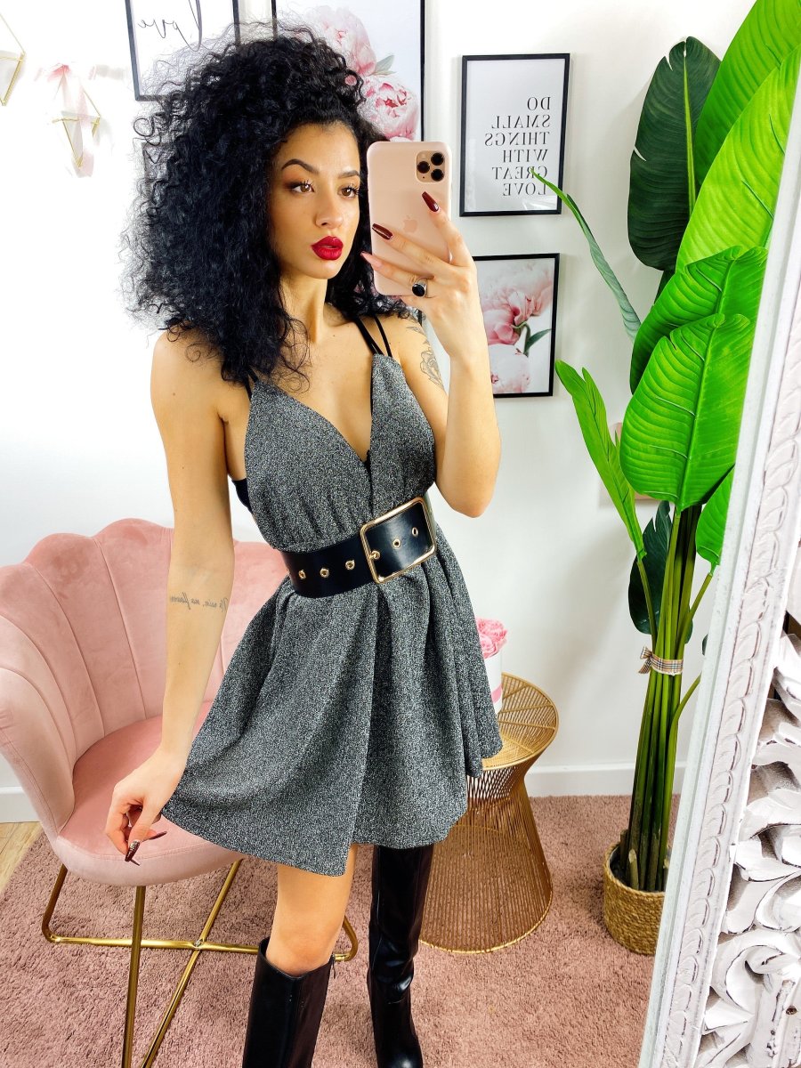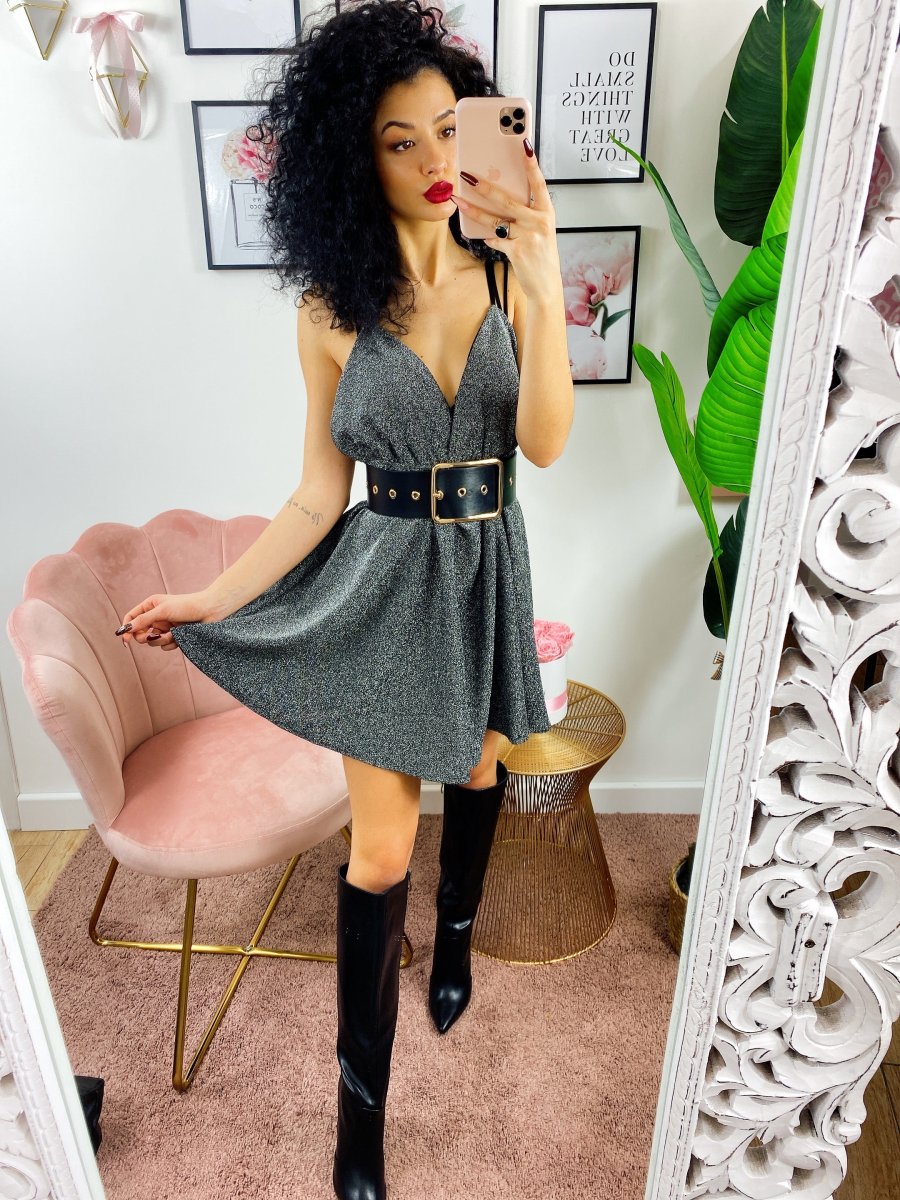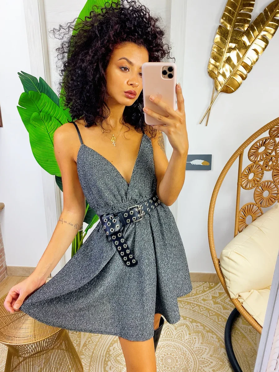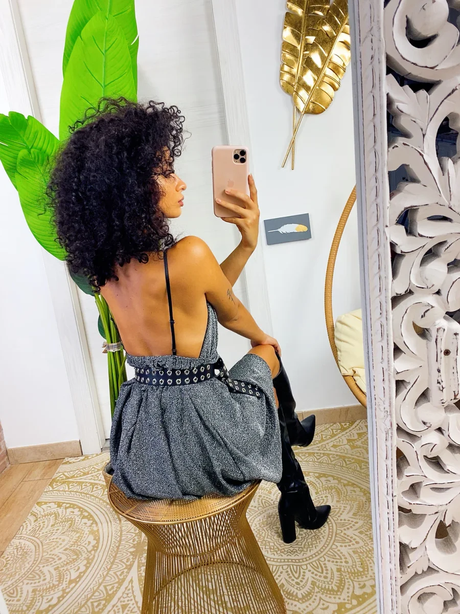 Abito a fiori a bretellina in tessuto glitterato. Schiena semi aperta.