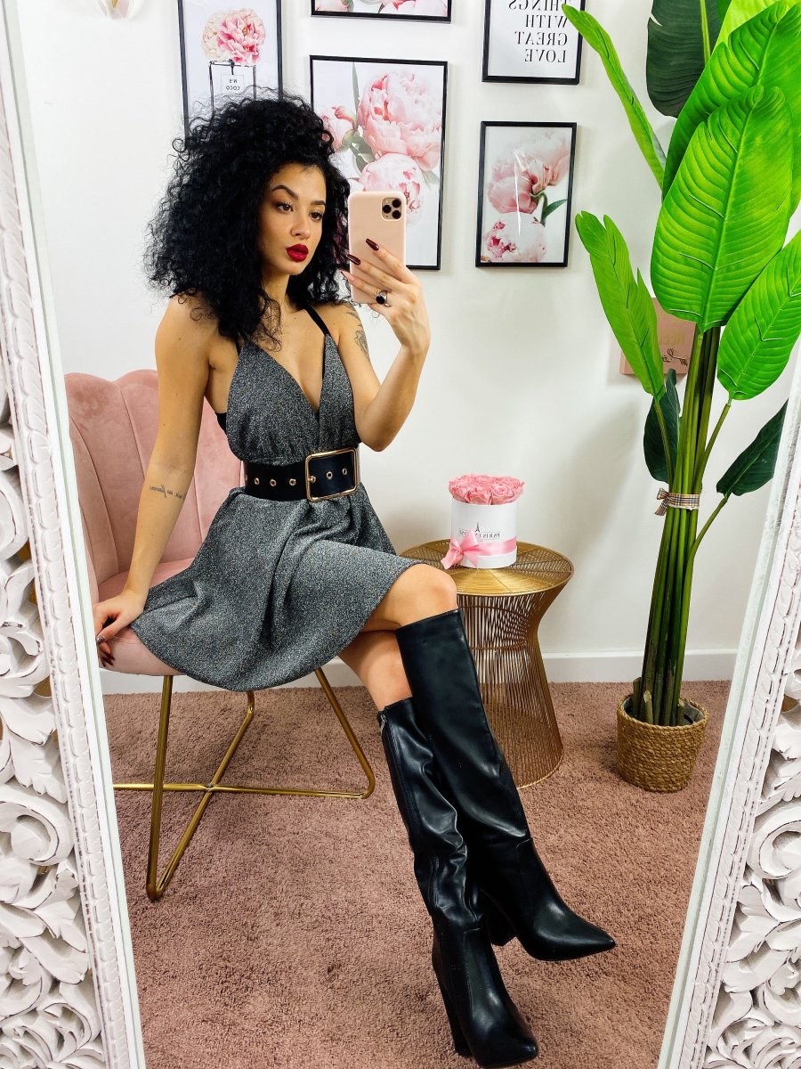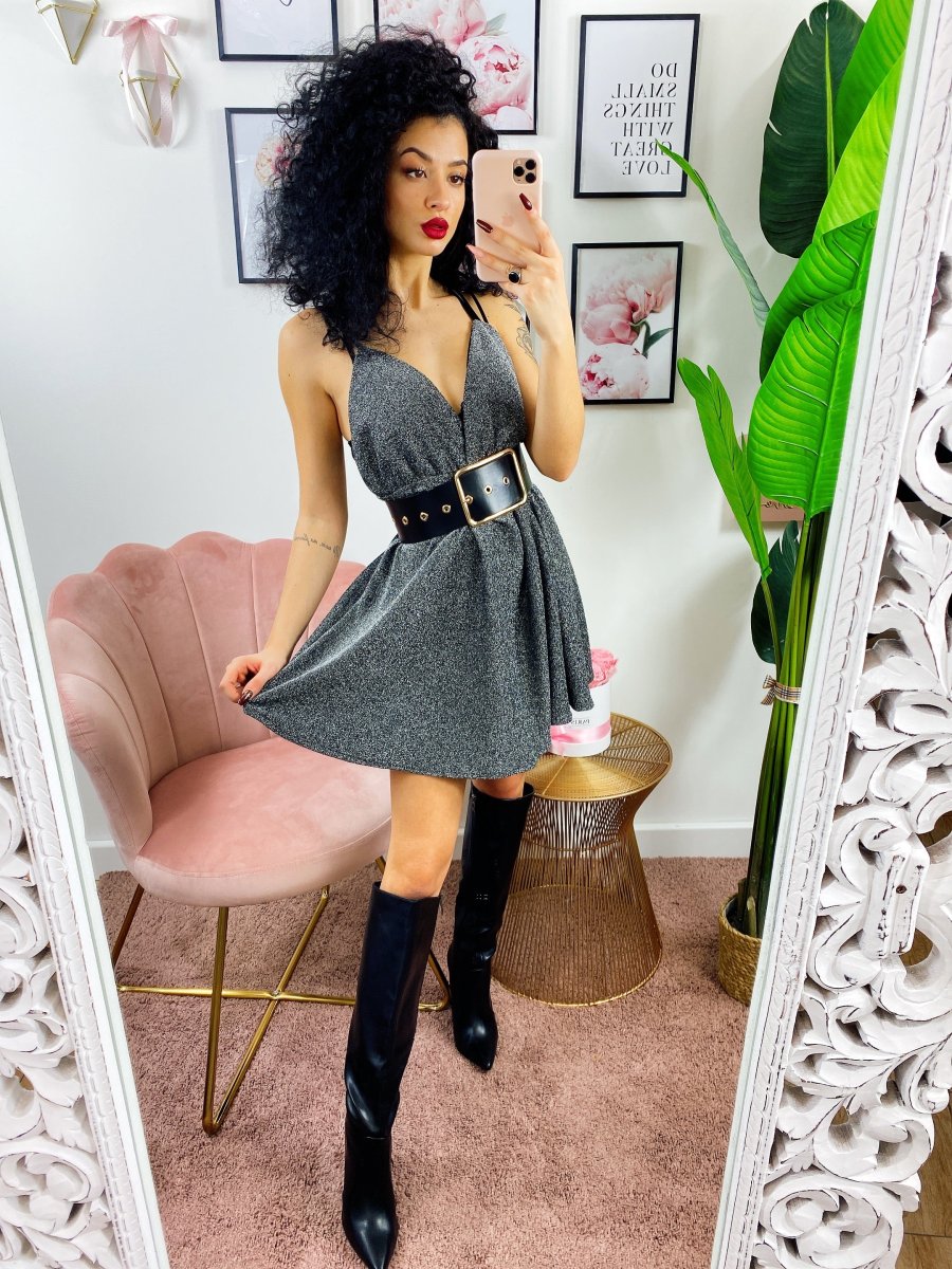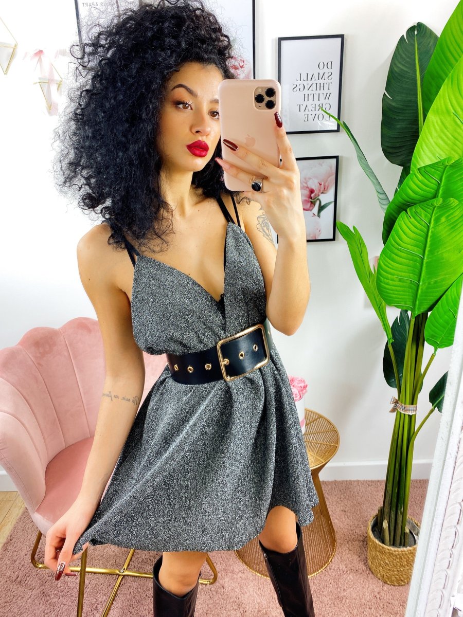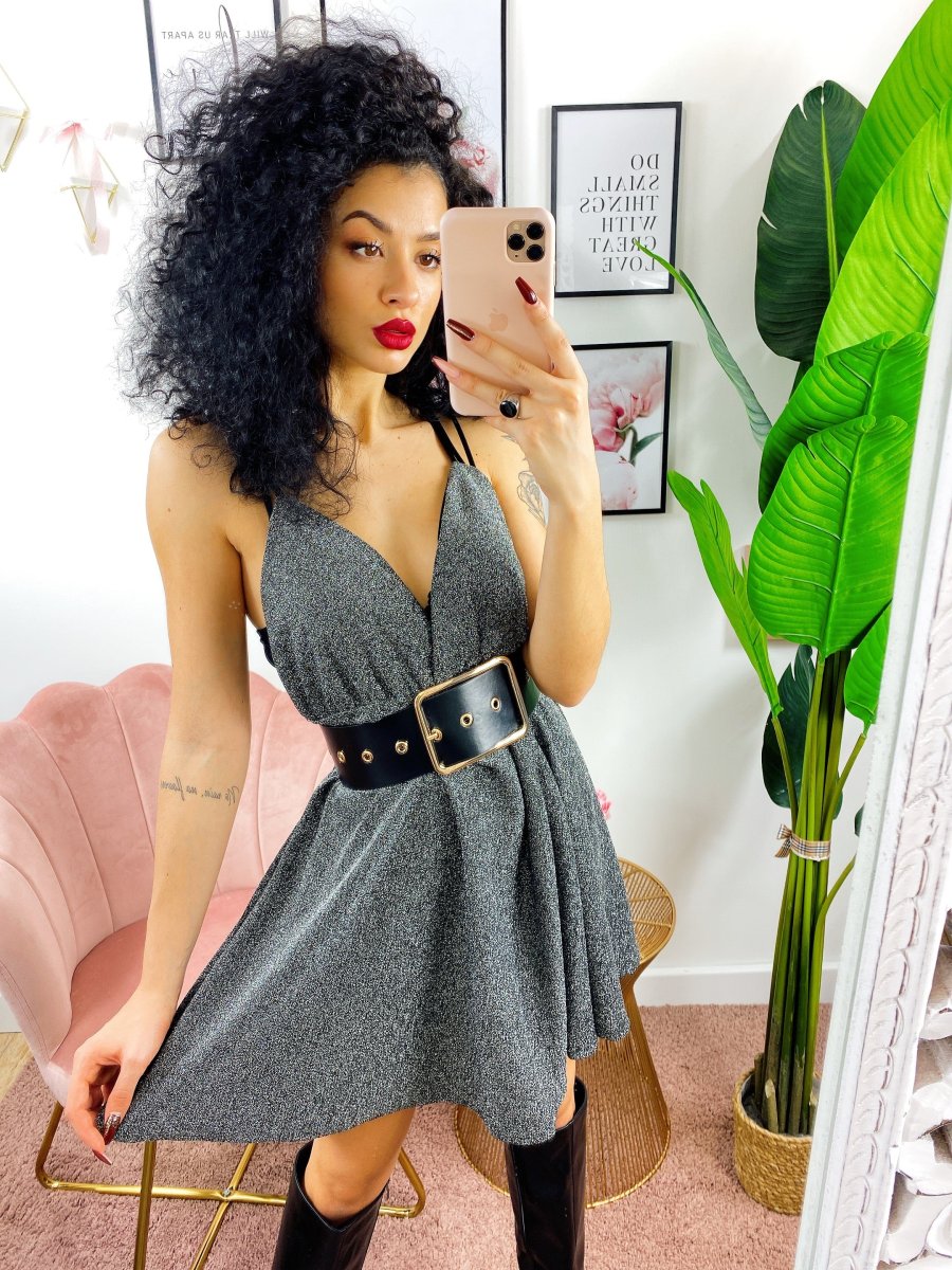 Abito a fiori a bretellina in tessuto glitterato. Schiena semi aperta.