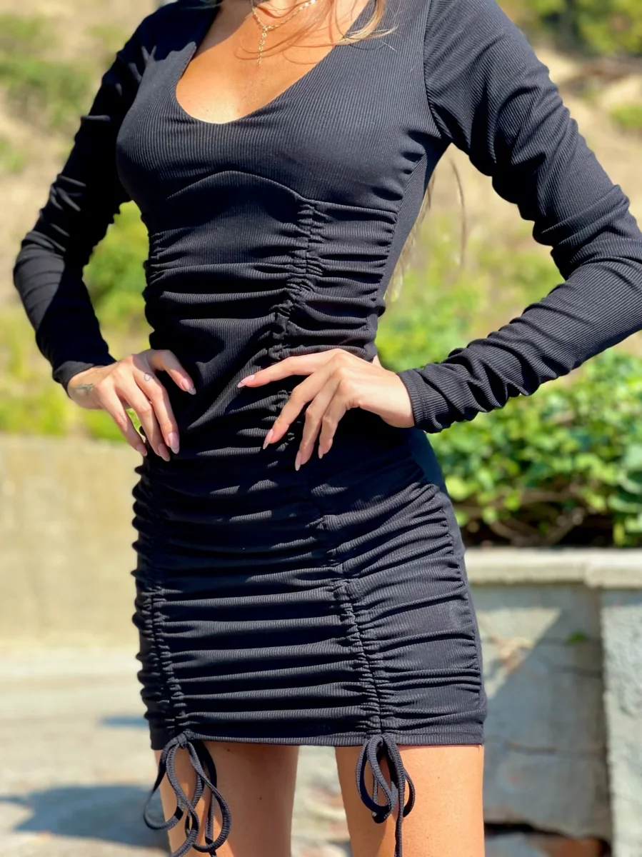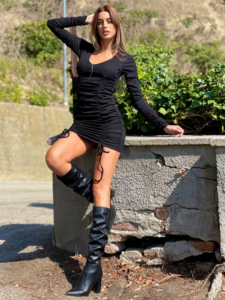 Abito a costine manica lunga con scollo a U. Doppia arricciatura sulle gambe.