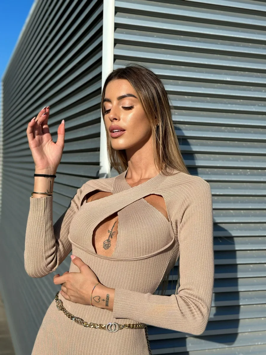 Abito a costine in tessuto pesante di qualità con incrocio a X sul seno. Modello senza coppe