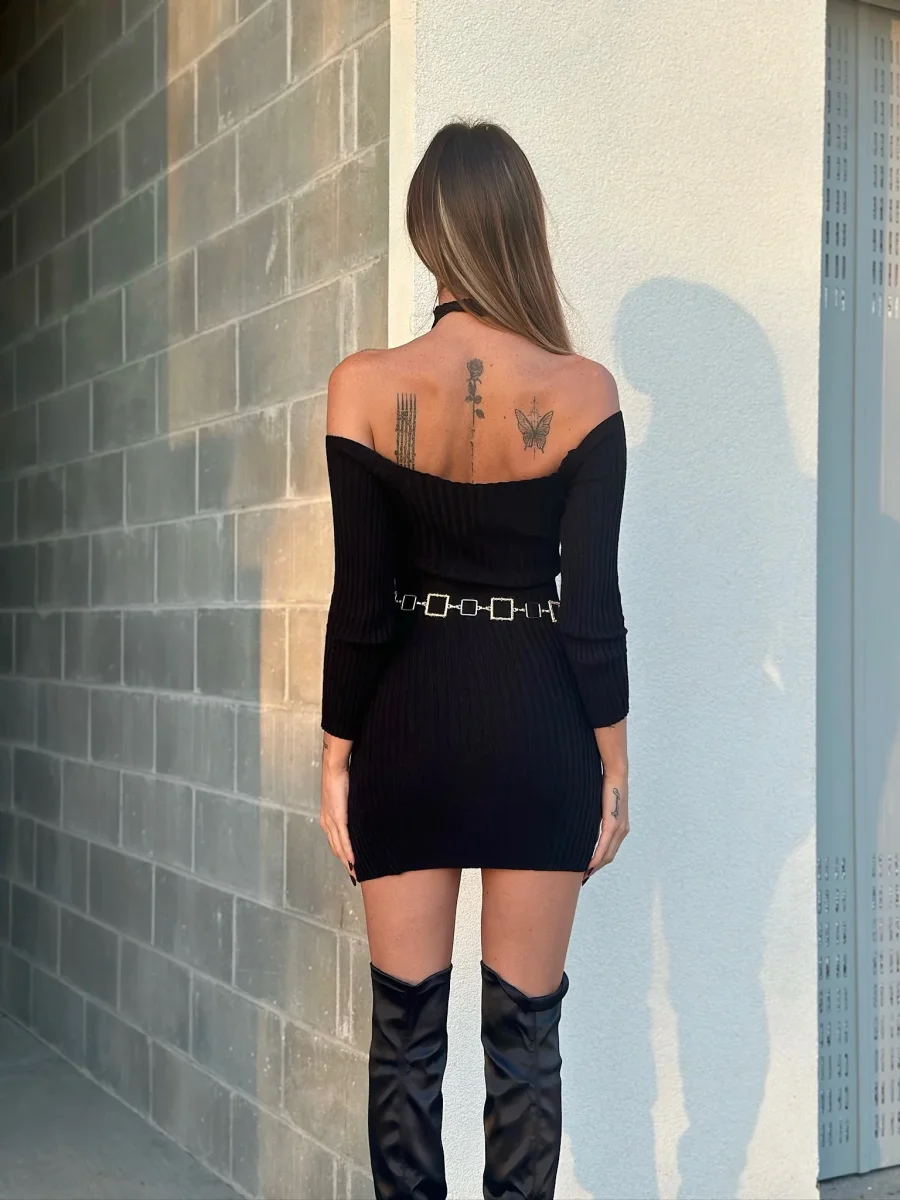 Abito a costine elasticizzato con incrocio sul collo e spacchetto nel fondo