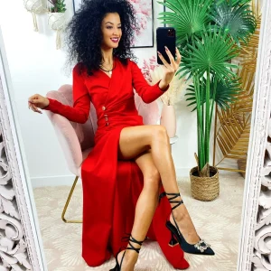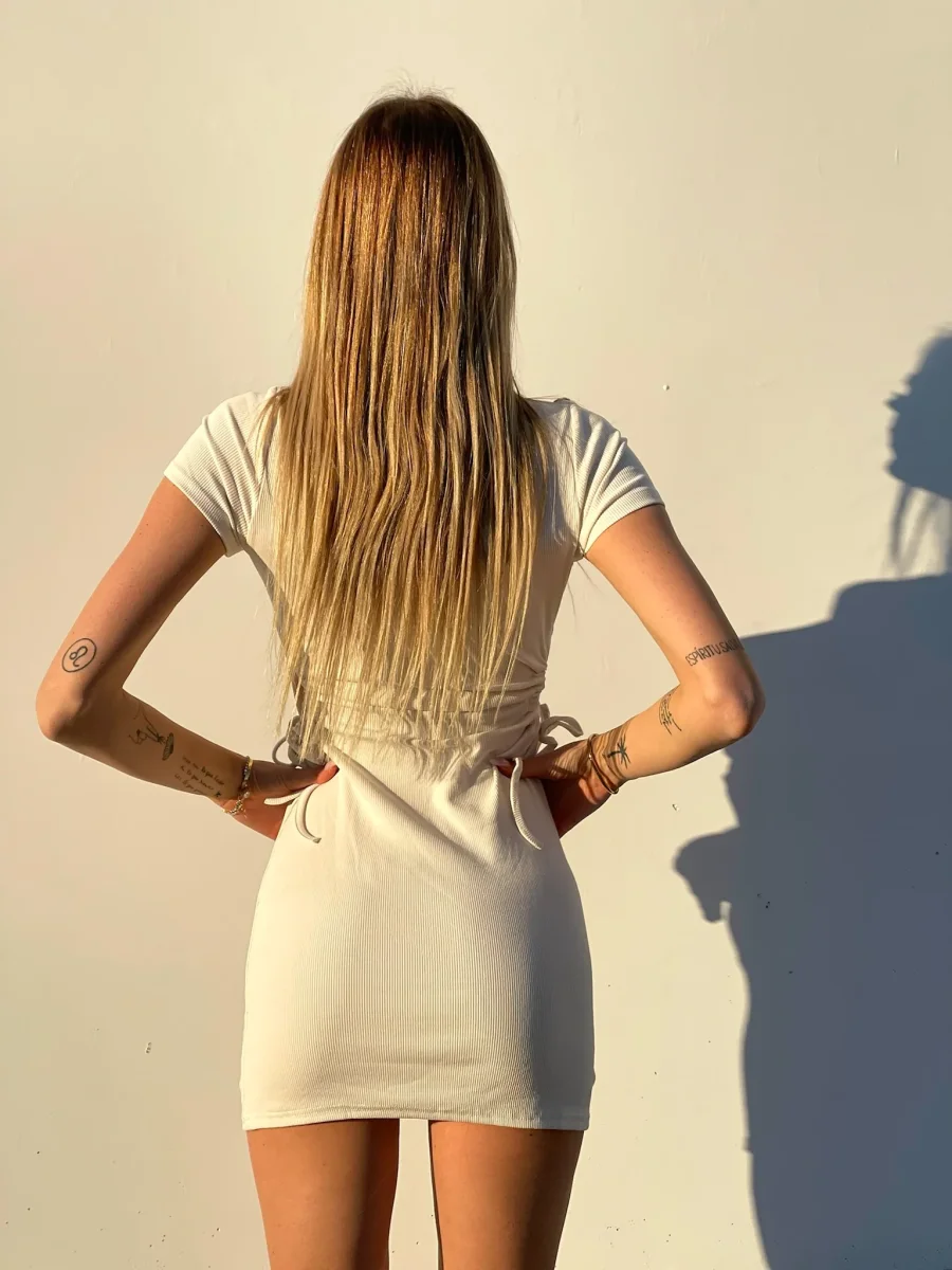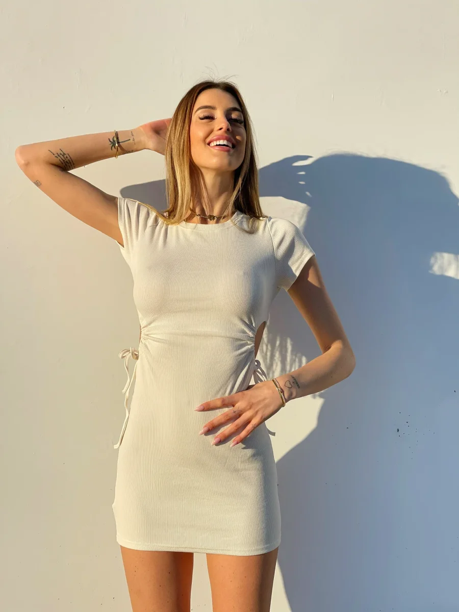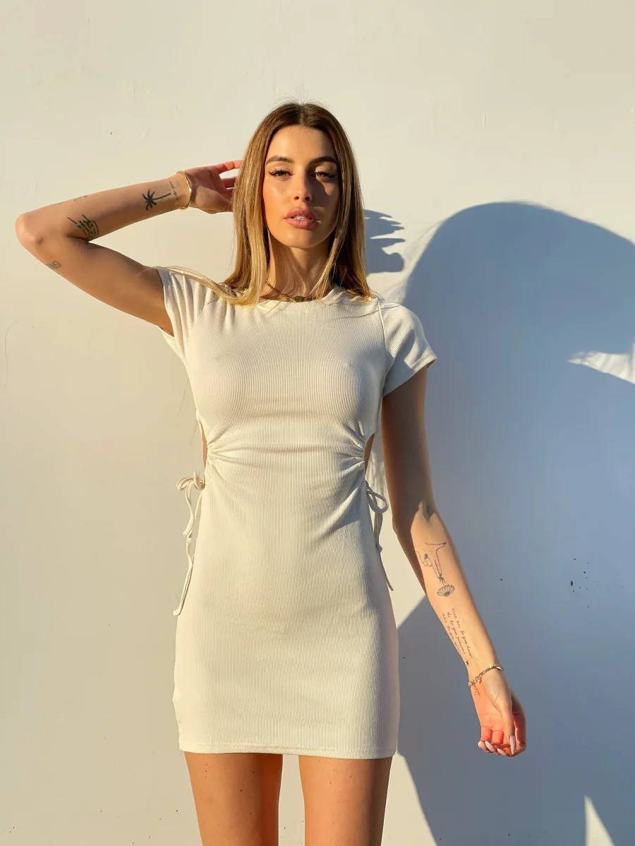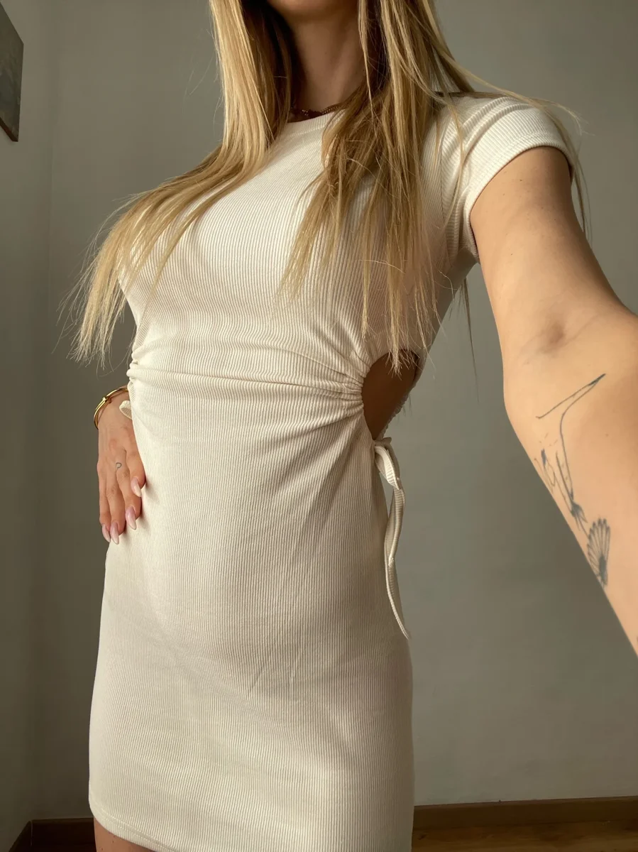 Abito a costine con buchi laterali regolabili da laccetto. Bottoncini oro sulle spalle. Tessuto molto comodo e elasticizzato