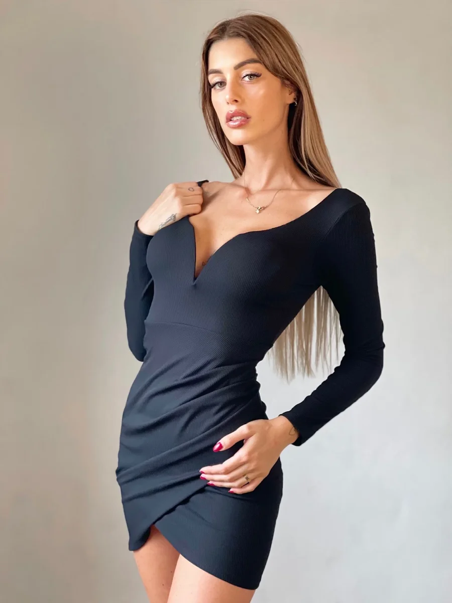 Abito a costine manica lunga con scollo a V, tessuto elasticizzato taglia unica