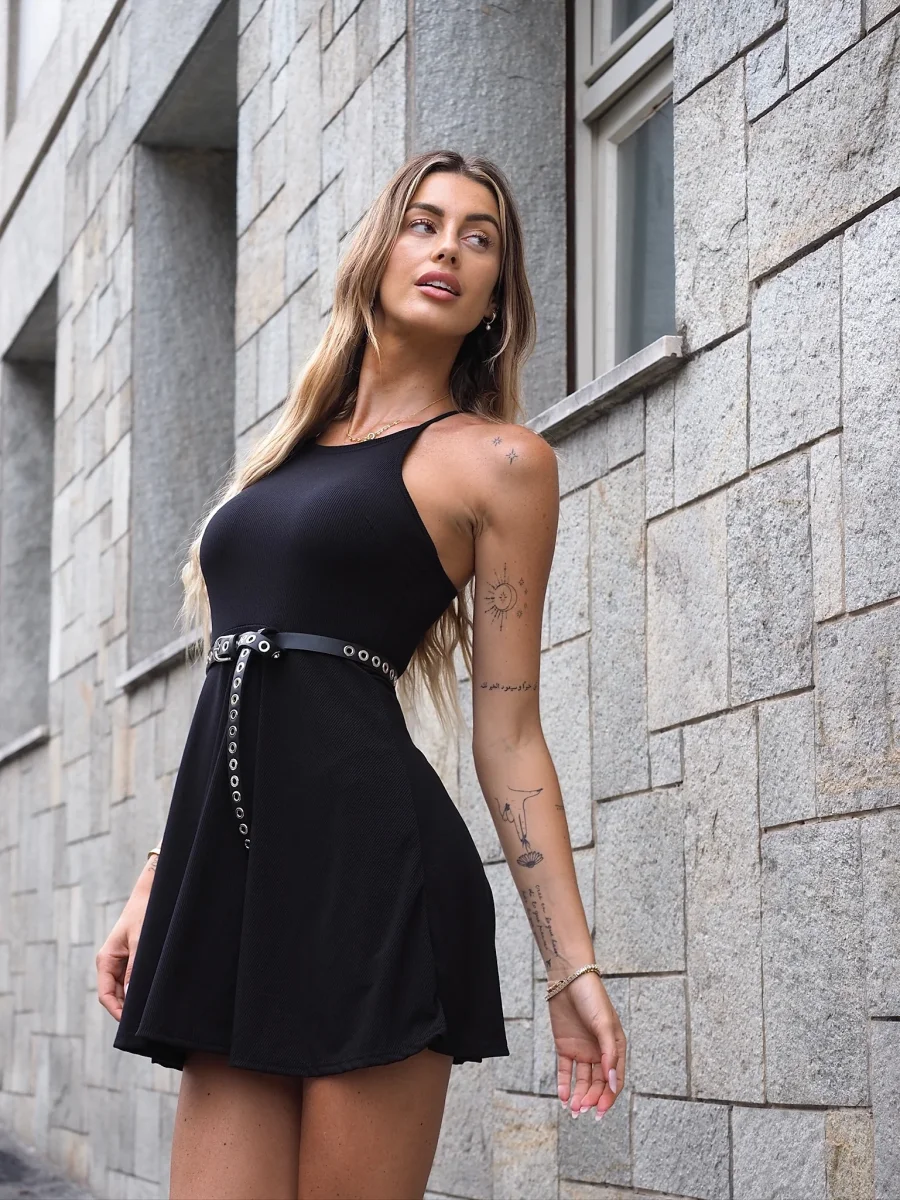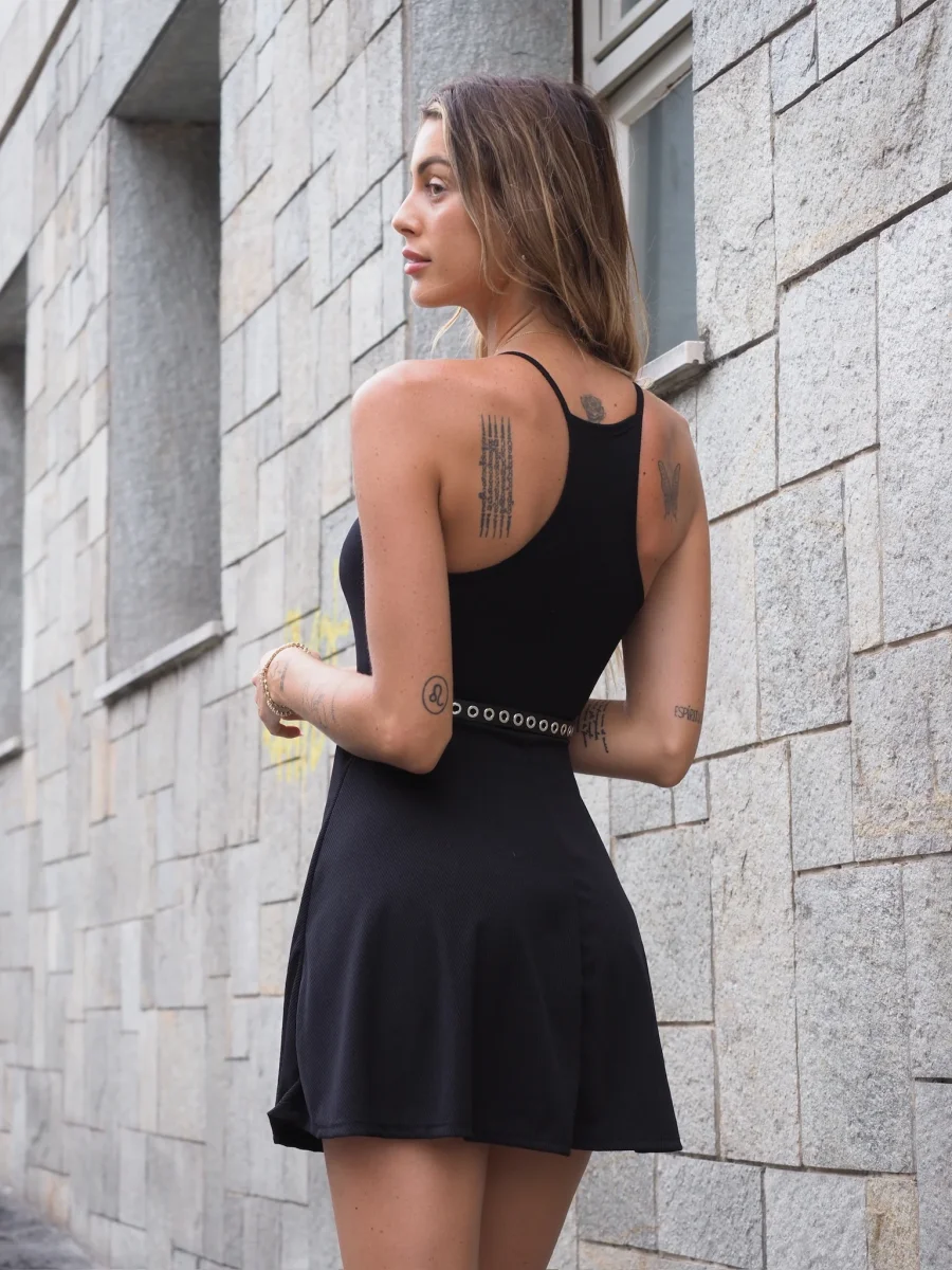Abito a costine Nero semplice senza coppe con taglio in vita e gonna ampia