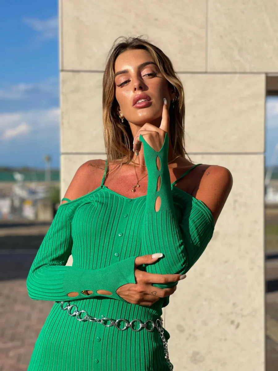 Abito in tessuto a costine di qualità elasticizzato, con manica lunga e spalline, fiorellini sulle maniche e bottoncini