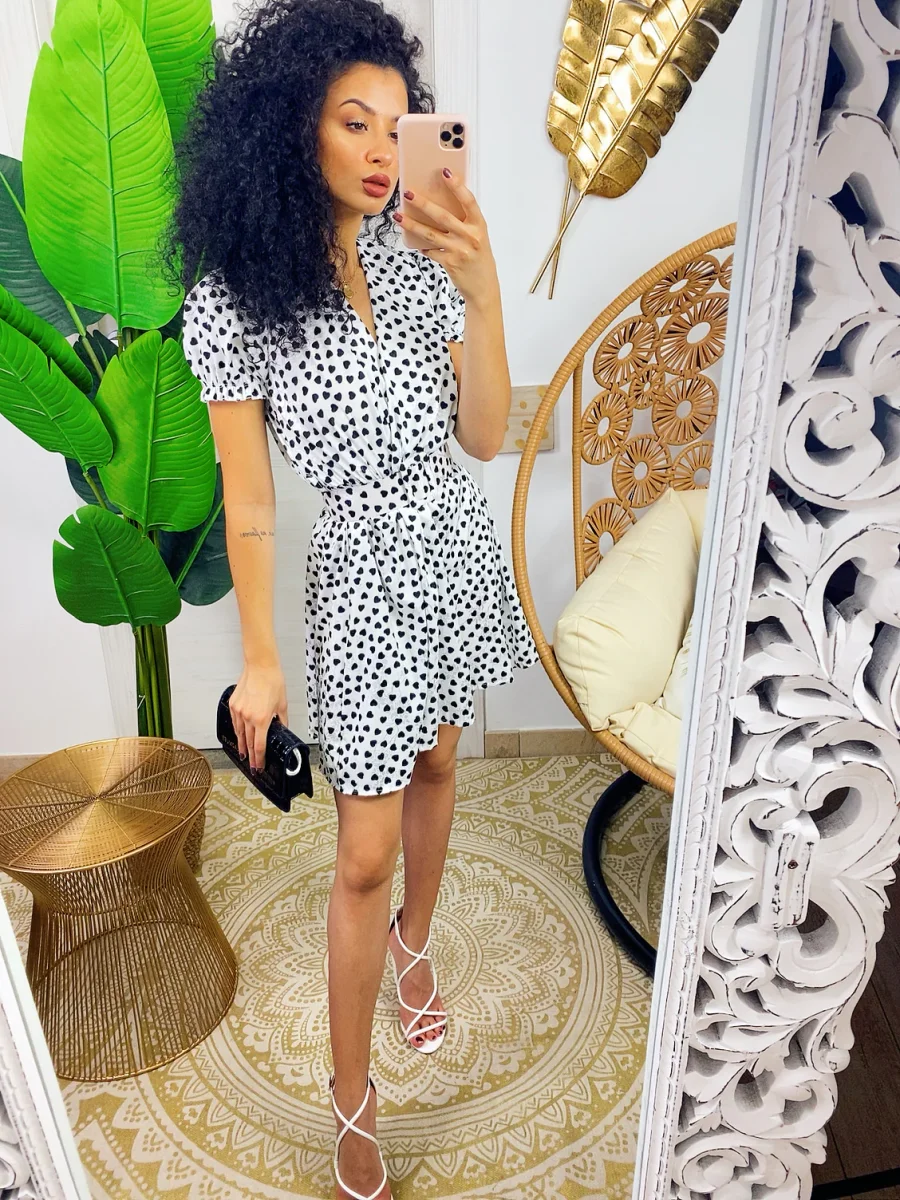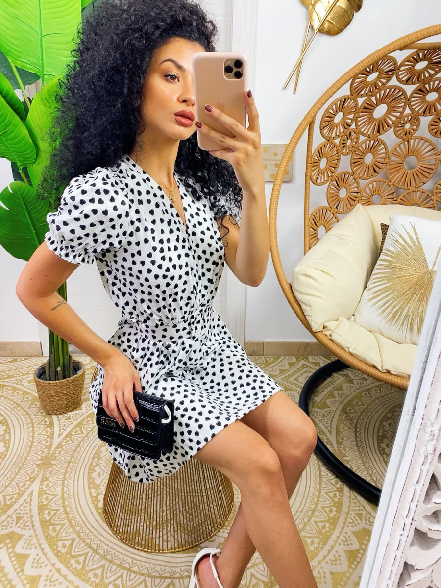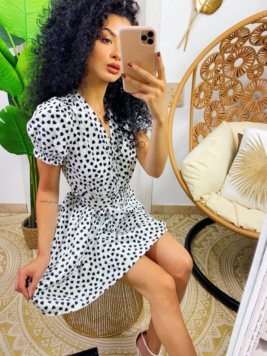 Abito in raso con cuoricini a contrasto. Scollo a V e manica a sbuffo con arricciatura. Cintura inclusa nell’abito.
