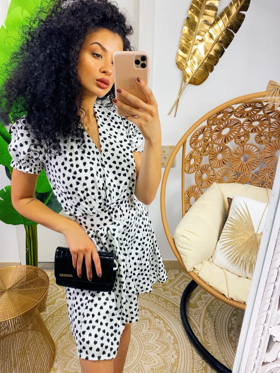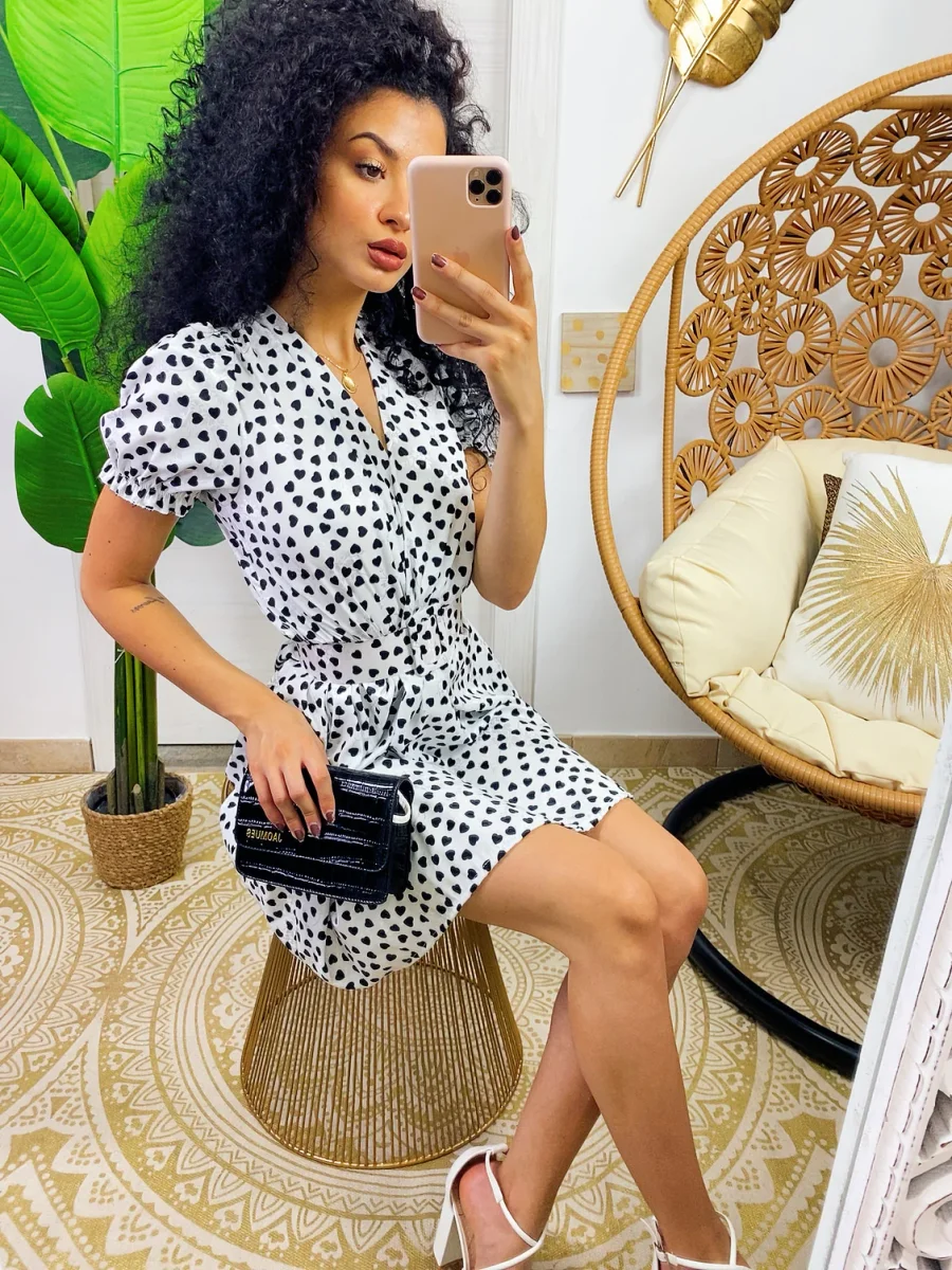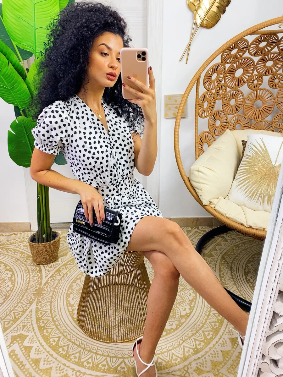 Abito in raso con cuoricini a contrasto. Scollo a V e manica a sbuffo con arricciatura. Cintura inclusa nell’abito.