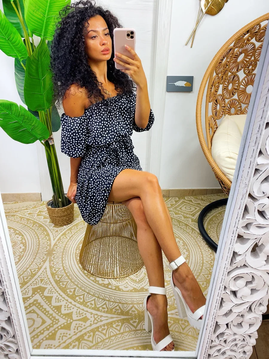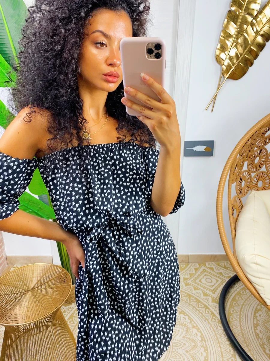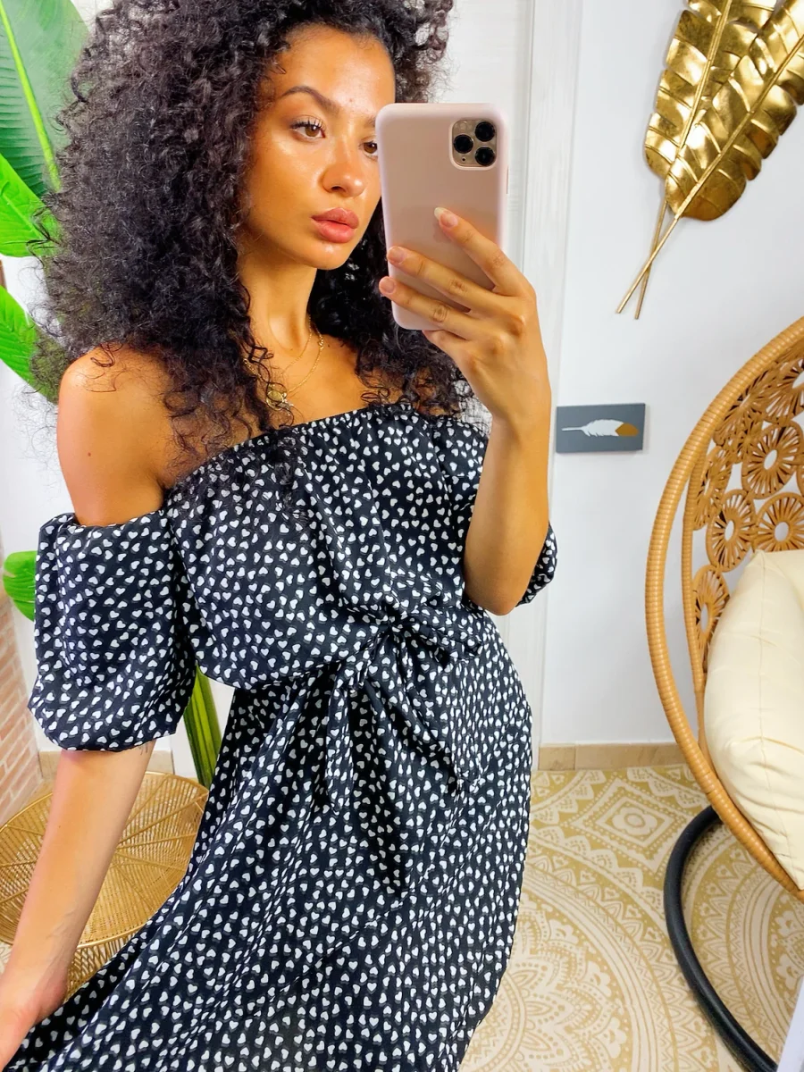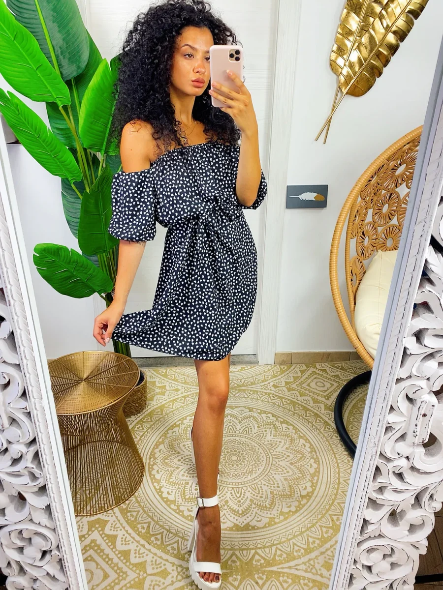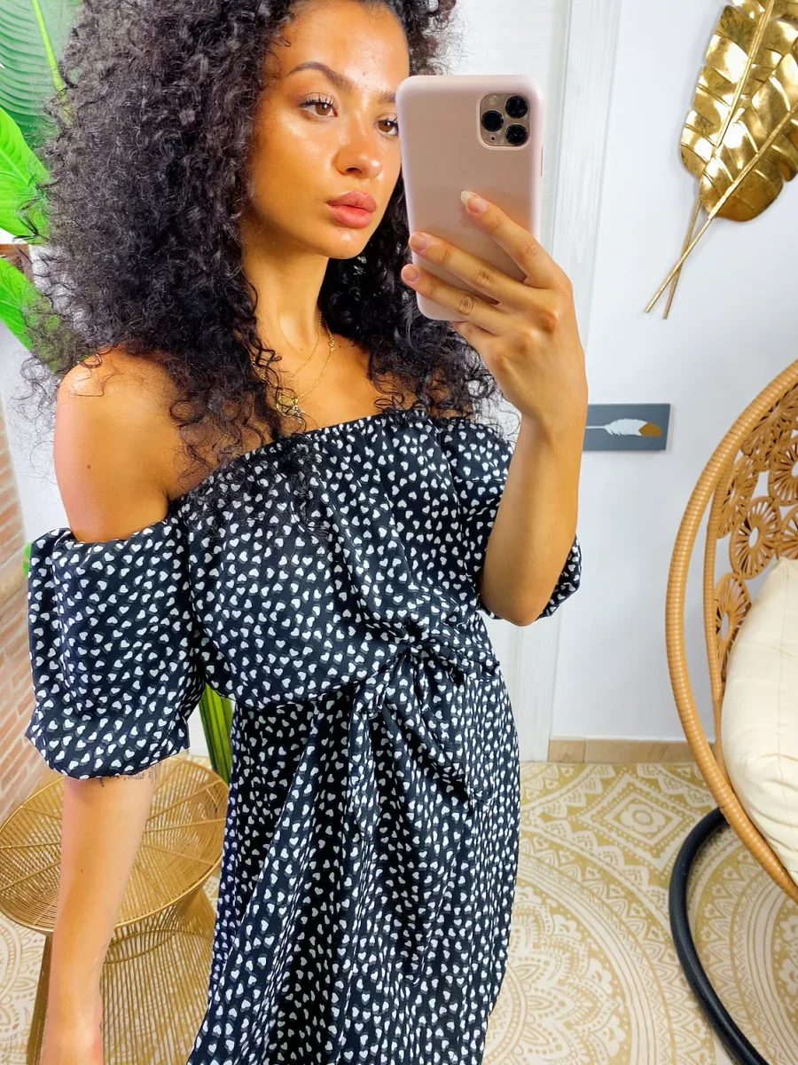 Abito a cuori con scollo a barchetta. Manichina e fusciacca in vita.