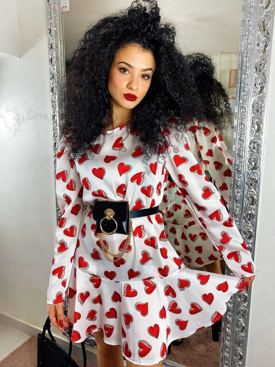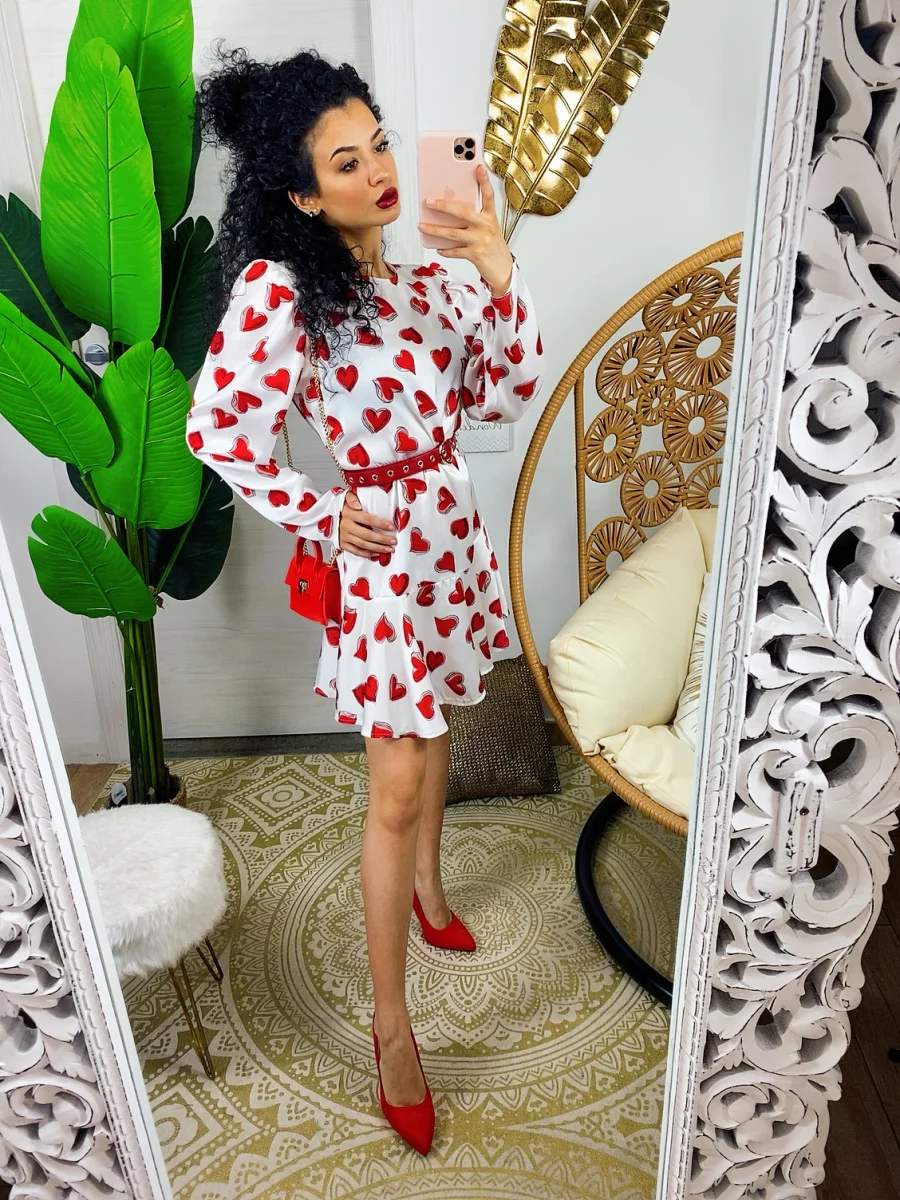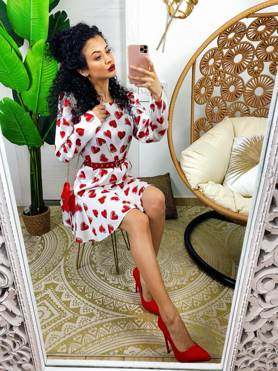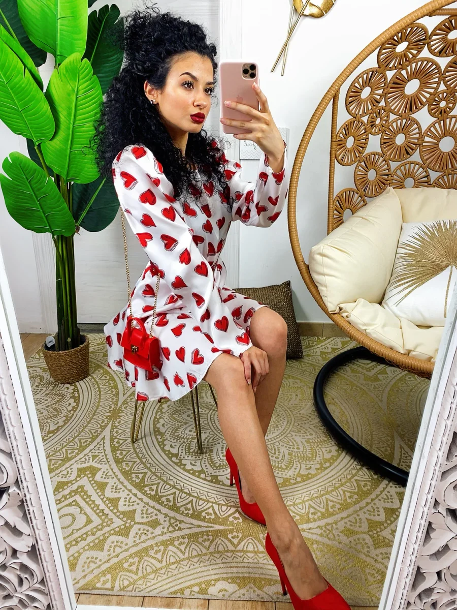 Abito in raso con maxi cuori rossi. Manica lunga morbida. Tessuto morbido