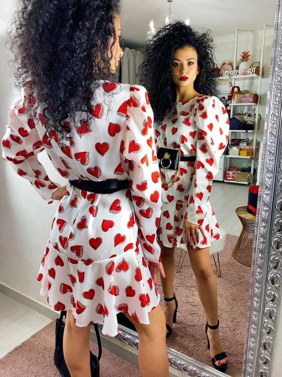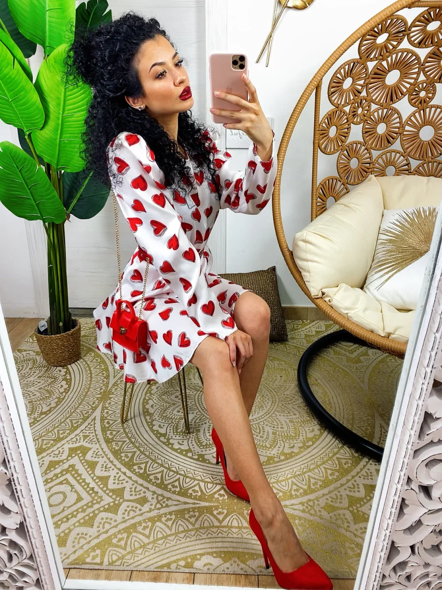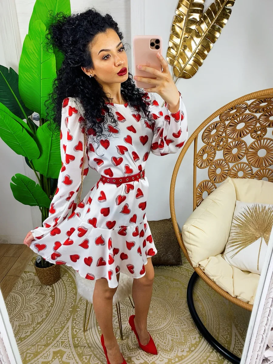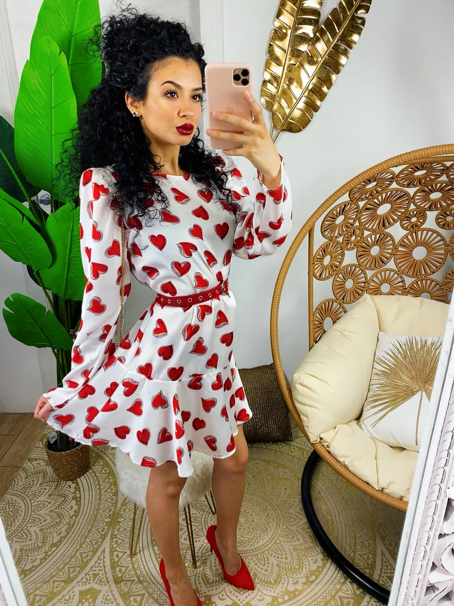 Abito in raso con maxi cuori rossi. Manica lunga morbida. Tessuto morbido