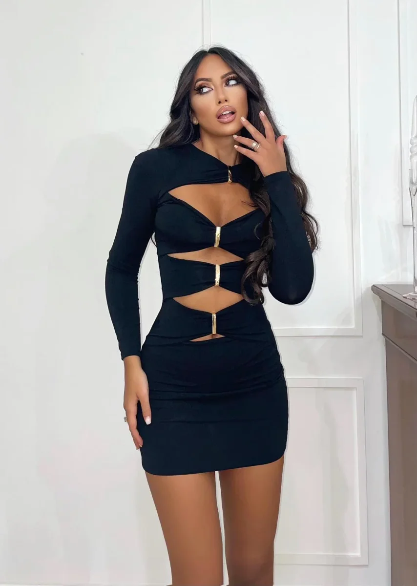 Abito in lycra a fasce con gioiello sul davanti, con coppe.