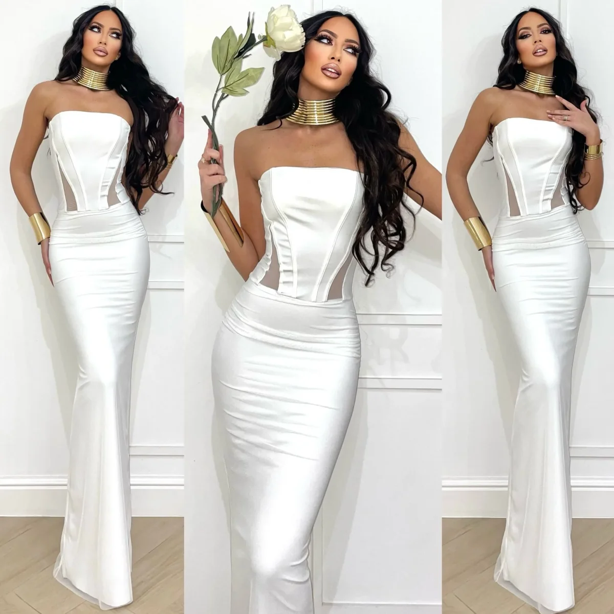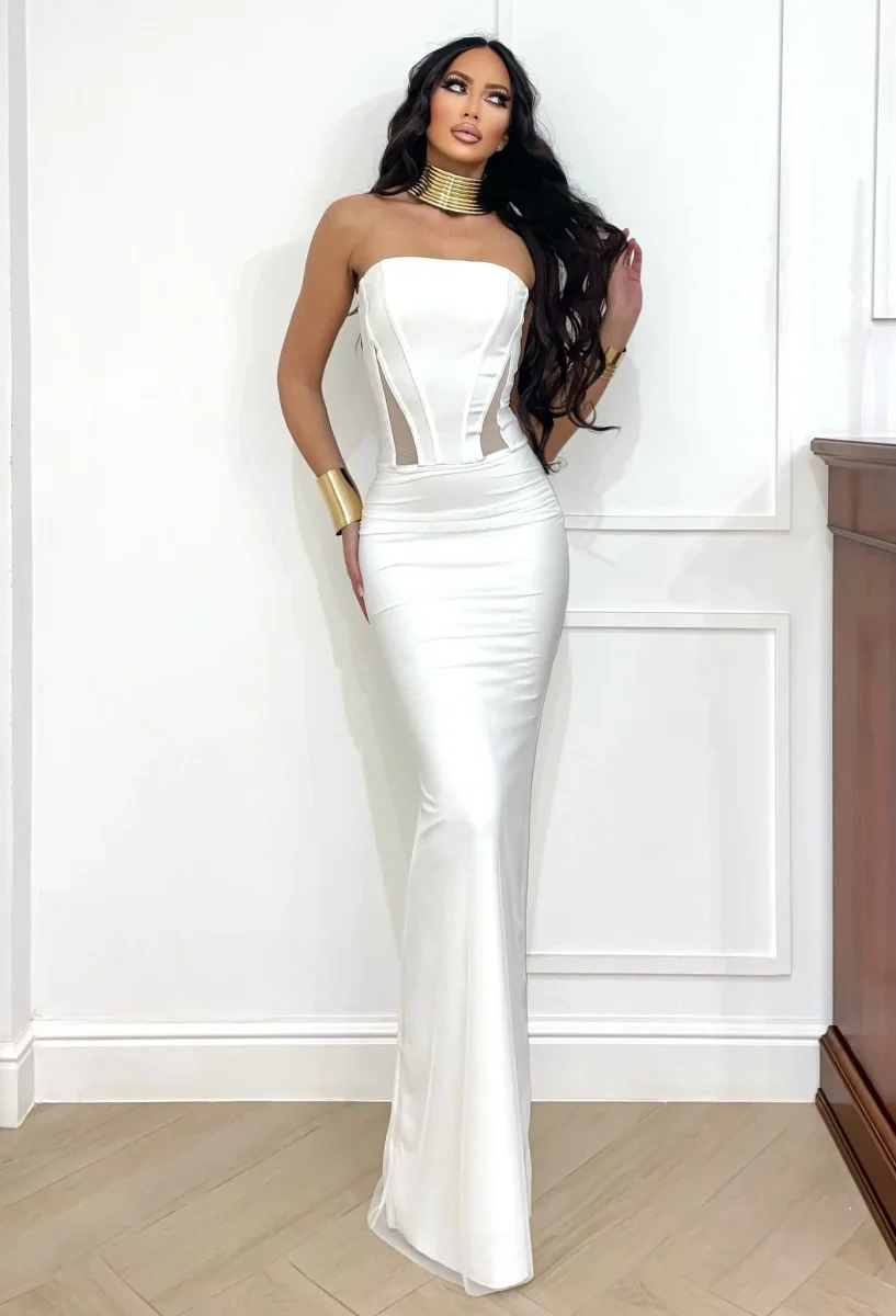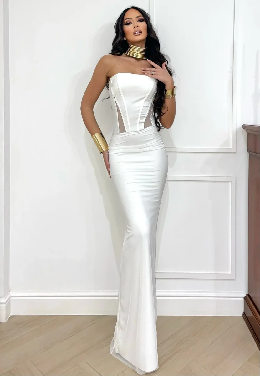 Abito a fascia bustier con gonna in velo bianco