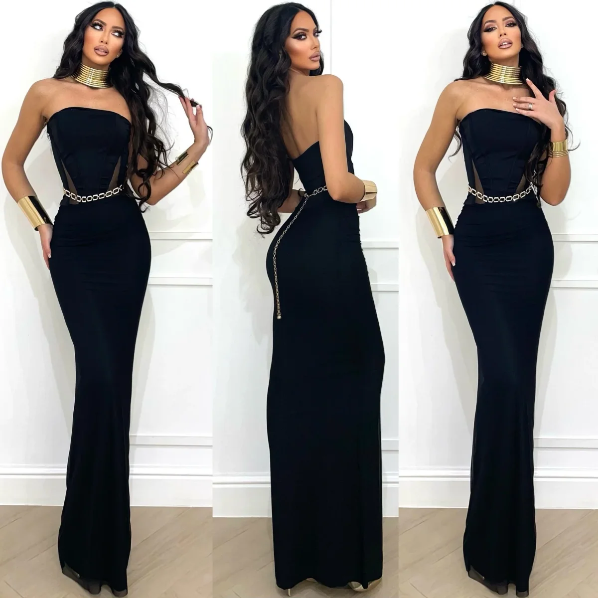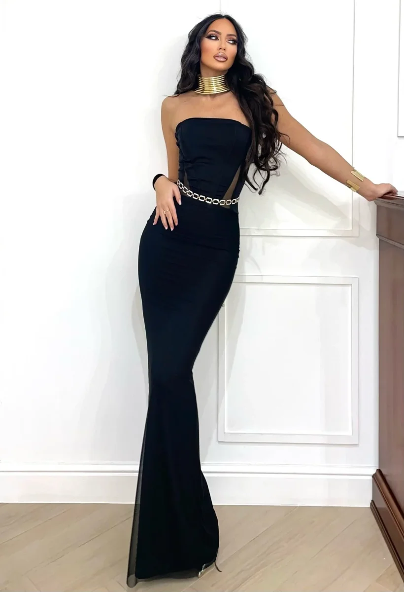 Abito a fascia effetto buste di con dettaglio stecche sul davanti. Gonna in tulle. Tessuto aderente e elasticizzato