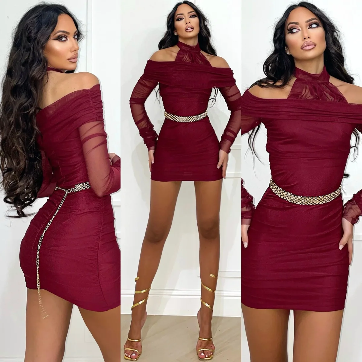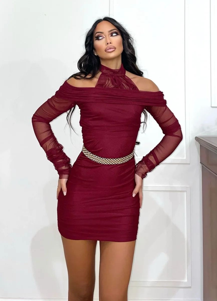 Abito nero a fascia in lycra con maniche e in velo e dettaglio in velo sul collo