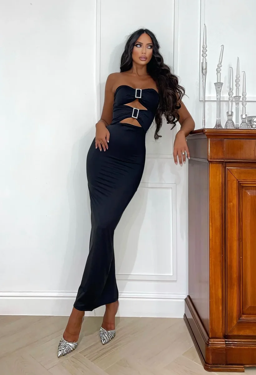 Abito a fascia in lycra in tessuto aderente e elascon coppe. Effetto a fasce con doppio gioiello argento. Spacco nel dietro