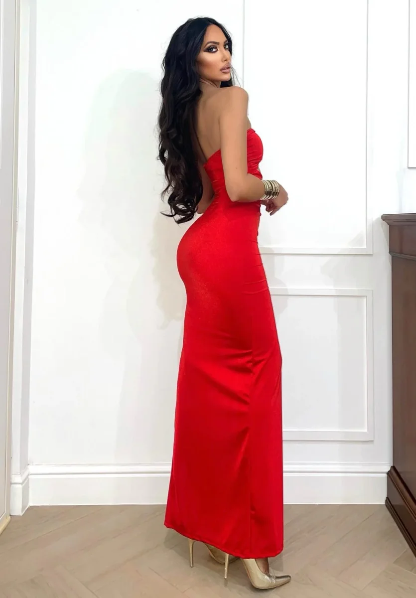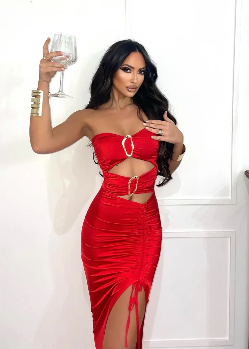 Abito a fascia in lycra aderente e elasticizzato con coppe e gioiello oro, arricciatura
