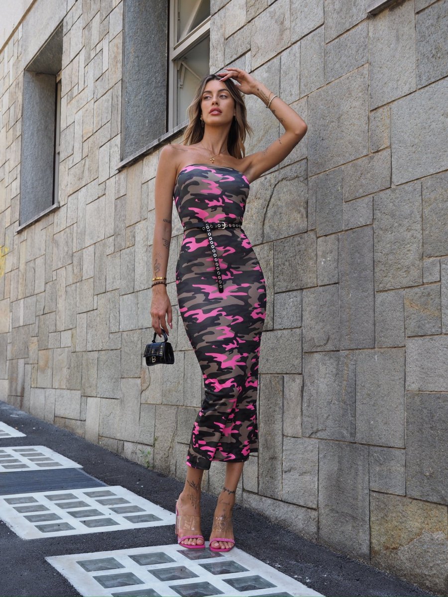 Abito basico semplice a fascia in tessuto militare con dettaglio Fuxia
