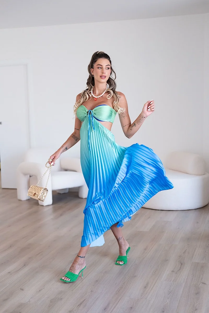 Abito di alta qualità a fascia con coppe e fiocco sul davanti, maxi gonna plissè sfumata.