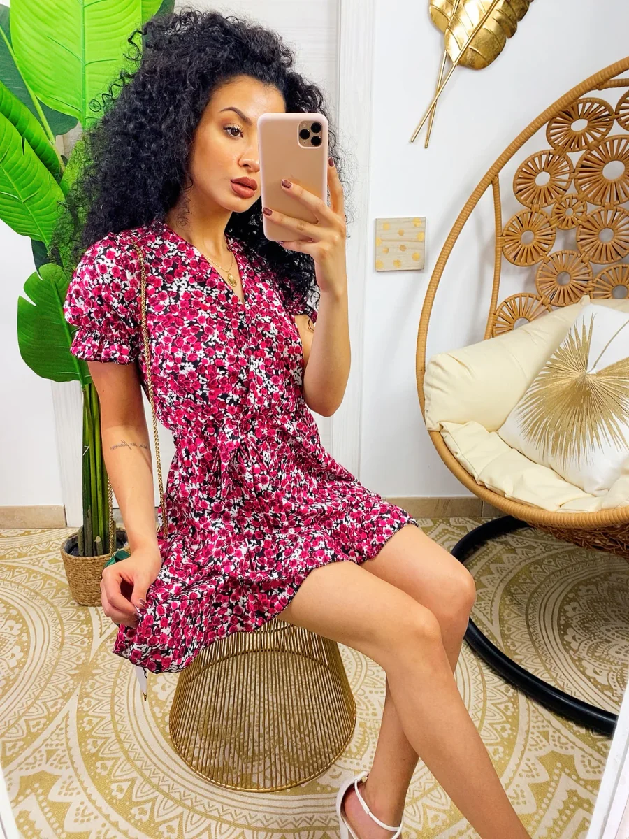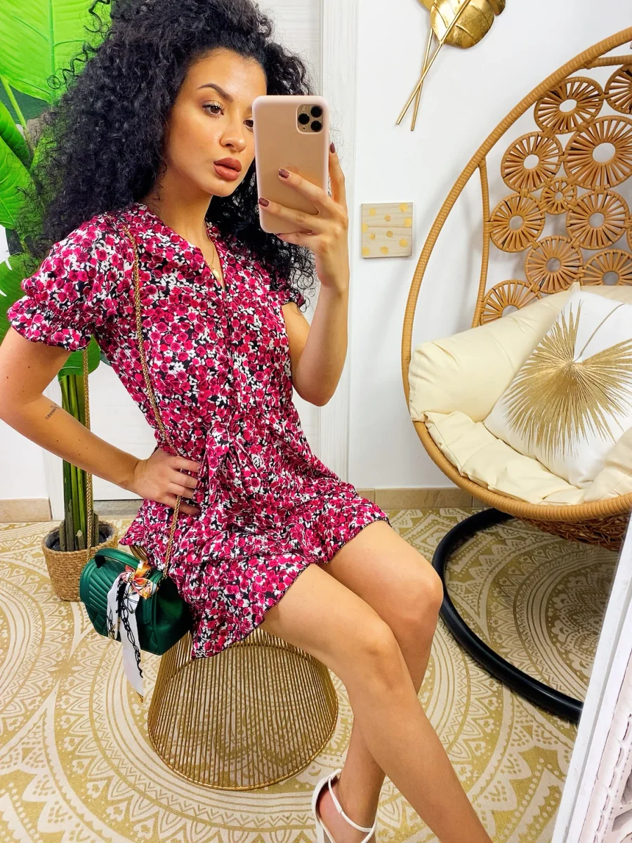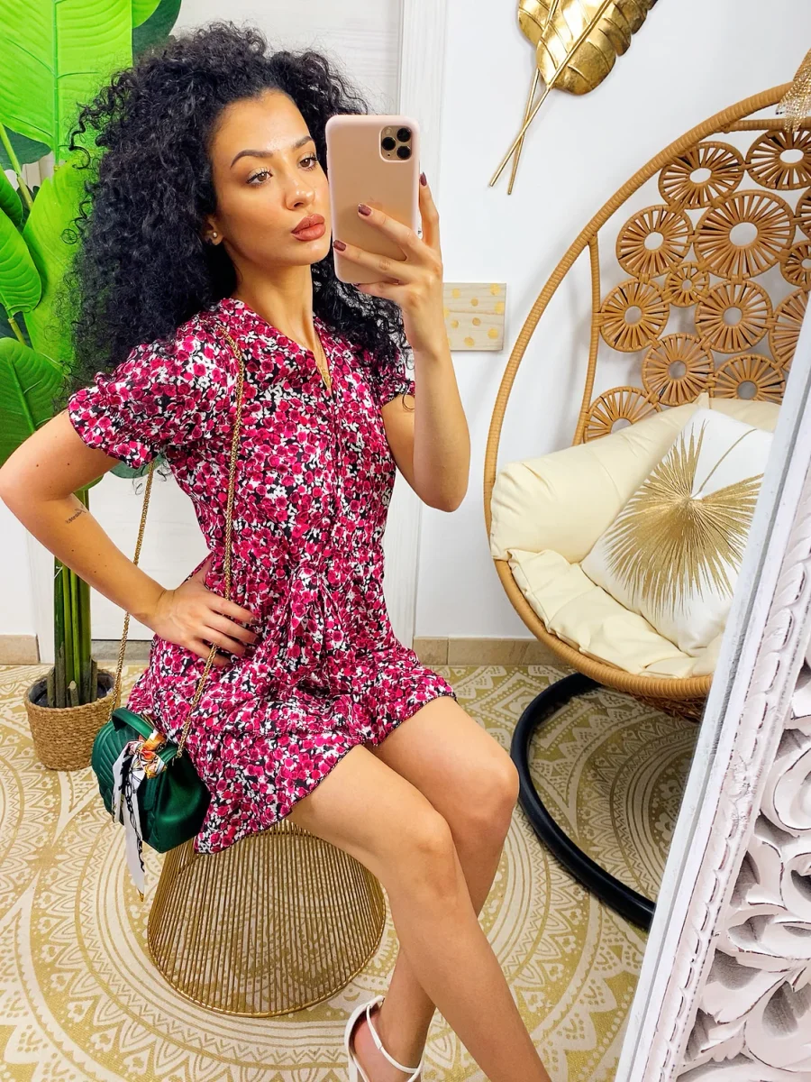 Abito a manica corta con sbuffo e rouge sul davanti. Tessuto leggero e fresco, laccio in vita.
